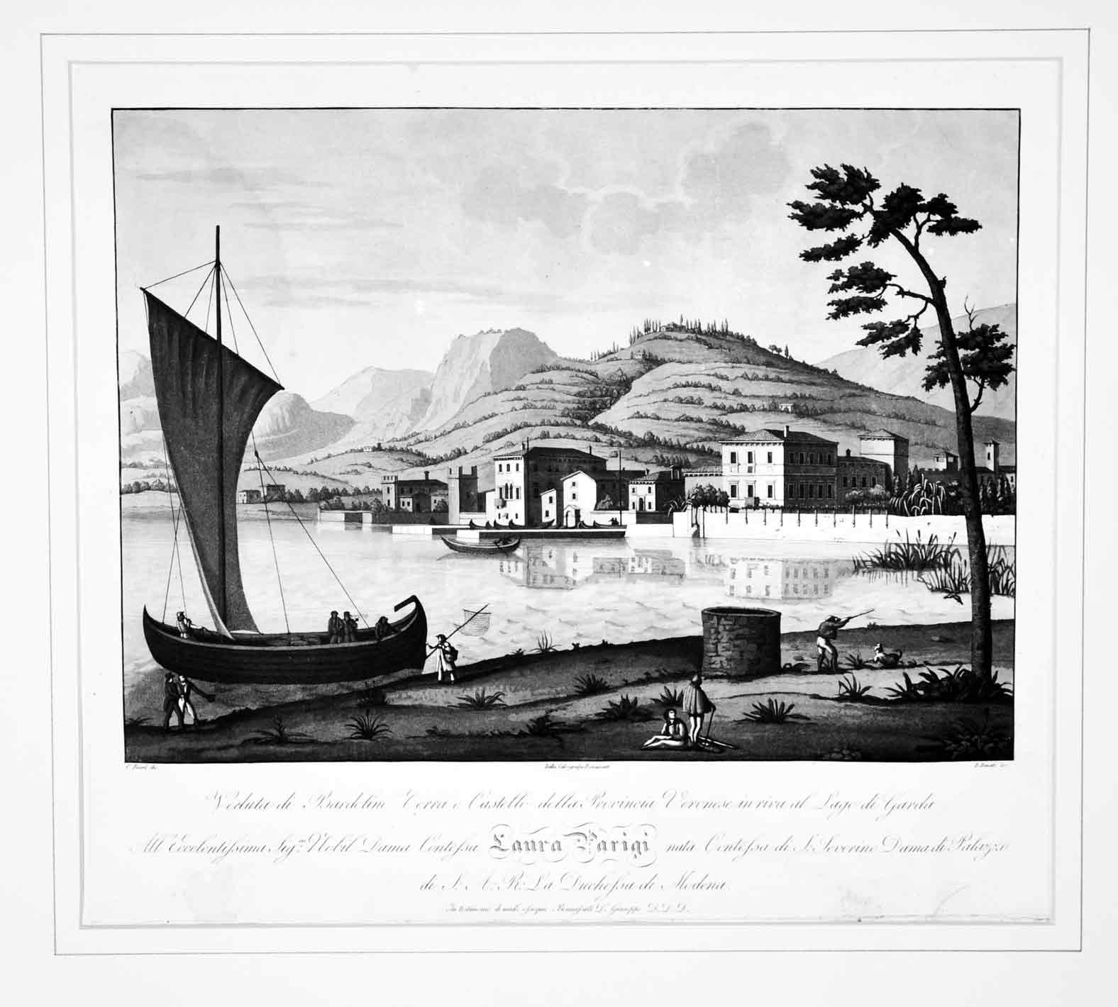 Bella e importante acquatinta (mm. 340x380), incisa da D. Bonatti su disegno di C. Bissol, sotto passepartout. E' dedicata All'eccelentissima Sig.ra Nobil Dama Contessa Laura Parigi nata Contessa di S. Severino Dama di Palazzo di S.A.R. La Duchessa di Modena. Cfr. Semenzato / Perini, Verona illustrata, p. 204: Le caratteristiche vedute del Bennassuti si distinguono per la loro liricità in un continuo alternarsi di luci e di ombre.. e sono fra le più prestigiose e rare.Lievi aloni ai marg. bianchi, altrimenti ben conservata.