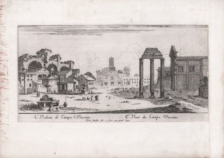 Veduta tratta dalla serie ' Veue de Rome. “Suite de 12 pièces numérotées, à gauche. Cette suite, dit Mariette, est du plus beau qui ait été fait par Silvestre. Il y a une pièce portant, à droite le n° 9, et qui semble devoir faire partie de cette suite, c'est : Veduta del torra Noua di Orleans. Veuë de la tour Neufve d'Orléans. Israël Silvestre deli. et fecit, cum priuil Regis (253 sur 126)”. (cfr. Faucheux, Catalogue raisonné de toutes les estampes qui forment l'oeuvre d'Israel Silvestre). Il Silvestre, incisore e disegnatore, nasce a Nancy nel 1621. Come era consuetudine all'epoca, fece diversi viaggi in Italia per copiare i vecchi maestri e per migliorare le sue abilità con i più grandi maestri. Faucheux fissa le date di questi viaggi, il primo prima del 1640 (Israel non aveva ancora 20 anni), il secondo dal 1643 al 1644 e l'ultimo intorno al 1653. Israel portò con sé molte vedute dell'Italia, quasi tutte incise. Fino al 1659, fece altri viaggi in Francia e in Lorena, da cui trasse molti disegni e incisioni. Il suo stile fu, all'inizio, piuttosto sciolto, ma dal 1643 in poi divenne più raffinato e delicato, acquisendo accuratezza e precisione senza essere asciutto, risultando a volte simile a quello di Jacques Callot o di Stefano della Bella, con i quali ebbe rapporti di amicizia attraverso il suo zio materno e mentore, l’editore Israël Henriet. Accanto alle testimonianze per la Roma antica mostrò ben presto un grandissimo interesse per la città "moderna", divenendo uno dei precursori del vedutismo - non solo nel campo incisorio - anticipando artisti come Lievin Cruyl e Gaspar van Wittel. È praticamente impossibile fare un inventario completo delle opere di Israël Silvestre, tanto era prolifico l'artista. Ha lasciato numerosi disegni e più di mille incisioni. Tra le sue opere più belle, possiamo tuttavia menzionare le numerose e complesse “piccole” suite (composte da poche tavole) sulle piazze, le chiese e le antichità di Roma. Acquaforte, in ottimo stato di conservazione. Bibliografia L. E. Faucheux, Catalogue raisonné de toutes les estampes qui forment l'oeuvre d'Israel Silvestre: précédé d'une notice sur sa vie (1857), n. 8.8; F. Baré, Israël Silvestre et sa famille, suivi du catalogue de son oeuvre (1885), n. 876. View taken from the series ' Veue de Rome. “Suite de 12 pièces numérotées, à gauche. Cette suite, dit Mariette, est du plus beau qui ait été fait par Silvestre. Il y a une pièce portant, à droite le n° 9, et qui semble devoir faire partie de cette suite, c'est : Veduta del torra Noua di Orleans. Veuë de la tour Neufve d'Orléans. Israël Silvestre deli. et fecit, cum priuil Regis (253 sur 126)”. (cfr. Faucheux, Catalogue raisonné de toutes les estampes qui forment l'oeuvre d'Israel Silvestre). Silvestre, engraver and draftsman, was born in Nancy in 1621. As was customary at the time, he made several trips to Italy to copy the old masters and to improve his skills with the greatest masters. Faucheux fixes the dates of these trips, the first before 1640 (Israel was not yet 20 years old), the second from 1643 to 1644 and the last around 1653. Israel brought with him many views of Italy, almost all of them engraved. Until 1659, he made other trips to France and Lorraine, from which he took many drawings and engravings. His style was, at the beginning, rather loose, but from 1643 onwards became more refined and delicate, acquiring accuracy and precision without being dry, resulting sometimes similar to that of Jacques Callot or Stefano della Bella, with whom he had friendly relations through his maternal uncle and mentor, the publisher Israël Henriet. Alongside the testimonies to ancient Rome, he soon showed great interest in the "modern" city, becoming one of the precursors of vedutism - not only in the field of engraving - anticipating artists such as Lievin Cruyl and Gaspar van Wittel. It is quite impossible here to make a complete inventory of Israël Silvestre's works, so prolific was the artist. He left numerous drawings and more than a thousand engravings. However, among his most beautiful works, we can mention the many complex "small" suites (composed of a few plates) on the squares, churches and antiquities of Rome. Etching, in excellent condition. Bibliografia L. E. Faucheux, Catalogue raisonné de toutes les estampes qui forment l'oeuvre d'Israel Silvestre: précédé d'une notice sur sa vie (1857), n. 8.8; F. Baré, Israël Silvestre et sa famille, suivi du catalogue de son oeuvre (1885), n. 876. Cfr.