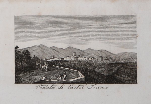 Veduta tratta dal celebre "Il viaggio pittorico della Toscana", stampato a Firenze, per Giovanni Marenigh, 1817.Celebre opera che costituisce uno straordinario affresco iconografico dell'intera Toscana. L'abate Francesco Fontani (Firenze, 1748-1818), dotto erudito, dopo gli studi compiuti nel seminario del Collegio Eugeniano si trasferì a Roma ove insegnò eloquenza nel Collegio Bandinelli. Si dedicò agli studi artistici e archeologici e, rientrato a Firenze, divenne Bibliotecario alla Riccardiana, occupandosi anche della Accademia della Crusca. Fu parroco nella chiesa di Santa Lucia dei Magnoli. "Il viaggio pittorico della Toscana" costuisce la sua opera più rinomata.Riproducendo fedelmente le tavole incise dai fratelli Terreni durante il loro viaggio del 1801,fu pubblicata la prima volta tra il 1801 e il 1803 per i tipi del Tofani a Firenze e in seguito, in questa versione ridotta nel formato, da Giovanni Marenigh nel 1817-1818 e nel 1822. Veduta tratta dal celebre "Il viaggio pittorico della Toscana", stampato a Firenze, per Giovanni Marenigh, 1817.Celebre opera che costituisce uno straordinario affresco iconografico dell'intera Toscana. L'abate Francesco Fontani (Firenze, 1748-1818), dotto erudito, dopo gli studi compiuti nel seminario del Collegio Eugeniano si trasferì a Roma ove insegnò eloquenza nel Collegio Bandinelli. Si dedicò agli studi artistici e archeologici e, rientrato a Firenze, divenne Bibliotecario alla Riccardiana, occupandosi anche della Accademia della Crusca. Fu parroco nella chiesa di Santa Lucia dei Magnoli. "Il viaggio pittorico della Toscana" costuisce la sua opera più rinomata.Riproducendo fedelmente le tavole incise dai fratelli Terreni durante il loro viaggio del 1801,fu pubblicata la prima volta tra il 1801 e il 1803 per i tipi del Tofani a Firenze e in seguito, in questa versione ridotta nel formato, da Giovanni Marenigh nel 1817-1818 e nel 1822. Cfr. Fossati Bellani, II, 3377; Lozzi, 5462, Bigazzi, 1341 e 1342, cita le edizioni 1801-1803 e 1817.