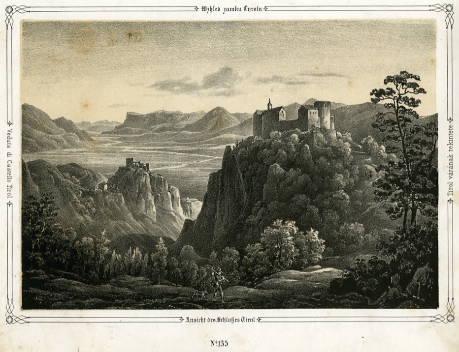 Litografia di dimensioni 15x22 cm. Condizioni : USATO - Stato : Buono, ordinari segni d'uso e del tempo. Bruniture ai margini. Altre note : Veduta di Castel Tirolo, non lontano da Merano. Edificato nel XII secolo dai conti di Venosta, ebbe poi enorme importanza storica come sede della famiglia dei Tirolo. Decaduto con il trasferimento del capoluogo a Innsbruck e il passaggio di potere agli Asburgo, è stato oggetto di opere di restauro negli ultimi due secoli ed è oggi sede del Museo storico-culturale della Provincia di Bolzano. La stampa si trova entro una semplice cornice, inframmezzata ai quattro lati dal titolo tradotto in quattro lingue diverse.