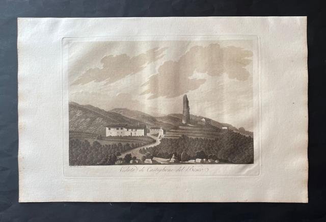 Dal “Viaggio Pittorico della Toscana” di Francesco Fontani, pubblicato per la prima volta a Firenze dall'editore Giuseppe Tofani, tra il 1801 e il 1803. Incisione in rame all'acquatinta disegnata e incisa da Antonio Terreni, b/n, cm 26 x 36 (alla lastra) più ampi margini. L'opera è considerata uno dei più importanti e suggestivi libri figurati sulla Toscana, sia per la qualità grafica delle incisioni, sia per la grande quantità delle località ritratte. Nei tre volumi in folio che compongono questa ponderosa pubblicazione sono infatti inserite duecentonove tavole, finemente incise all'acquatinta e stampate a inchiostro bruno dai fratelli Antonio e Jacopo Terreni (attivi a Livorno e Firenze tra la fine del diciottesimo e l'inizio del diciannovesimo secolo), da Giovanni Pera e da altri. Nove di queste tavole sono stampate a doppia pagina, raffigurando la carta della regione, una pianta e la veduta delle città principali: Firenze, Siena, Pisa, Livorno; tutte le altre sono stampate a foglio singolo e raffigurano architetture o paesaggi relativi sia alle principali località che ai centri minori della Toscana. Notevole fu il successo del “Viaggio Pittorico della Toscana”, anche per il seguito di riproduzioni e di rifacimenti cui fu sottoposto il suo corredo grafico, in Italia e all'estero. Moltissimi altri libri furono infatti illustrati in seguito con incisioni derivanti dalla grafica dei fratelli Terreni, mentre una seconda edizione dell'opera venne alla luce, in formato ridotto, tra il 1817 e il 1818. Ottimo esemplare.