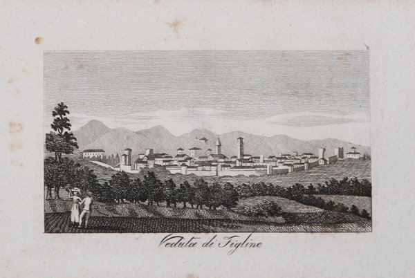 Veduta tratta dal celebre "Il viaggio pittorico della Toscana", stampato a Firenze, per Giovanni Marenigh, 1817.Celebre opera che costituisce uno straordinario affresco iconografico dell'intera Toscana. L'abate Francesco Fontani (Firenze, 1748-1818), dotto erudito, dopo gli studi compiuti nel seminario del Collegio Eugeniano si trasferì a Roma ove insegnò eloquenza nel Collegio Bandinelli. Si dedicò agli studi artistici e archeologici e, rientrato a Firenze, divenne Bibliotecario alla Riccardiana, occupandosi anche della Accademia della Crusca. Fu parroco nella chiesa di Santa Lucia dei Magnoli. "Il viaggio pittorico della Toscana" costuisce la sua opera più rinomata.Riproducendo fedelmente le tavole incise dai fratelli Terreni durante il loro viaggio del 1801,fu pubblicata la prima volta tra il 1801 e il 1803 per i tipi del Tofani a Firenze e in seguito, in questa versione ridotta nel formato, da Giovanni Marenigh nel 1817-1818 e nel 1822. Veduta tratta dal celebre "Il viaggio pittorico della Toscana", stampato a Firenze, per Giovanni Marenigh, 1817.Celebre opera che costituisce uno straordinario affresco iconografico dell'intera Toscana. L'abate Francesco Fontani (Firenze, 1748-1818), dotto erudito, dopo gli studi compiuti nel seminario del Collegio Eugeniano si trasferì a Roma ove insegnò eloquenza nel Collegio Bandinelli. Si dedicò agli studi artistici e archeologici e, rientrato a Firenze, divenne Bibliotecario alla Riccardiana, occupandosi anche della Accademia della Crusca. Fu parroco nella chiesa di Santa Lucia dei Magnoli. "Il viaggio pittorico della Toscana" costuisce la sua opera più rinomata.Riproducendo fedelmente le tavole incise dai fratelli Terreni durante il loro viaggio del 1801,fu pubblicata la prima volta tra il 1801 e il 1803 per i tipi del Tofani a Firenze e in seguito, in questa versione ridotta nel formato, da Giovanni Marenigh nel 1817-1818 e nel 1822. Cfr. Fossati Bellani, II, 3377; Lozzi, 5462, Bigazzi, 1341 e 1342, cita le edizioni 1801-1803 e 1817.