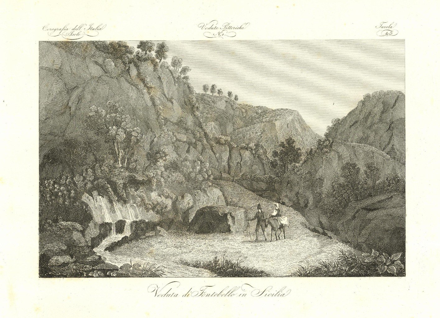 Veduta della fonte situata tra le montagne. Stampa antica originale