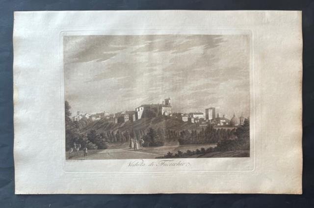 Dal “Viaggio Pittorico della Toscana” di Francesco Fontani, pubblicato per la prima volta a Firenze dall'editore Giuseppe Tofani, tra il 1801 e il 1803. Incisione in rame all'acquatinta disegnata e incisa da Antonio Terreni, b/n, cm 26 x 36 (alla lastra) più ampi margini. L'opera è considerata uno dei più importanti e suggestivi libri figurati sulla Toscana, sia per la qualità grafica delle incisioni, sia per la grande quantità delle località ritratte. Nei tre volumi in folio che compongono questa ponderosa pubblicazione sono infatti inserite duecentonove tavole, finemente incise all'acquatinta e stampate a inchiostro bruno dai fratelli Antonio e Jacopo Terreni (attivi a Livorno e Firenze tra la fine del diciottesimo e l'inizio del diciannovesimo secolo), da Giovanni Pera e da altri. Nove di queste tavole sono stampate a doppia pagina, raffigurando la carta della regione, una pianta e la veduta delle città principali: Firenze, Siena, Pisa, Livorno; tutte le altre sono stampate a foglio singolo e raffigurano architetture o paesaggi relativi sia alle principali località che ai centri minori della Toscana. Notevole fu il successo del “Viaggio Pittorico della Toscana”, anche per il seguito di riproduzioni e di rifacimenti cui fu sottoposto il suo corredo grafico, in Italia e all'estero. Moltissimi altri libri furono infatti illustrati in seguito con incisioni derivanti dalla grafica dei fratelli Terreni, mentre una seconda edizione dell'opera venne alla luce, in formato ridotto, tra il 1817 e il 1818. Ottimo esemplare.