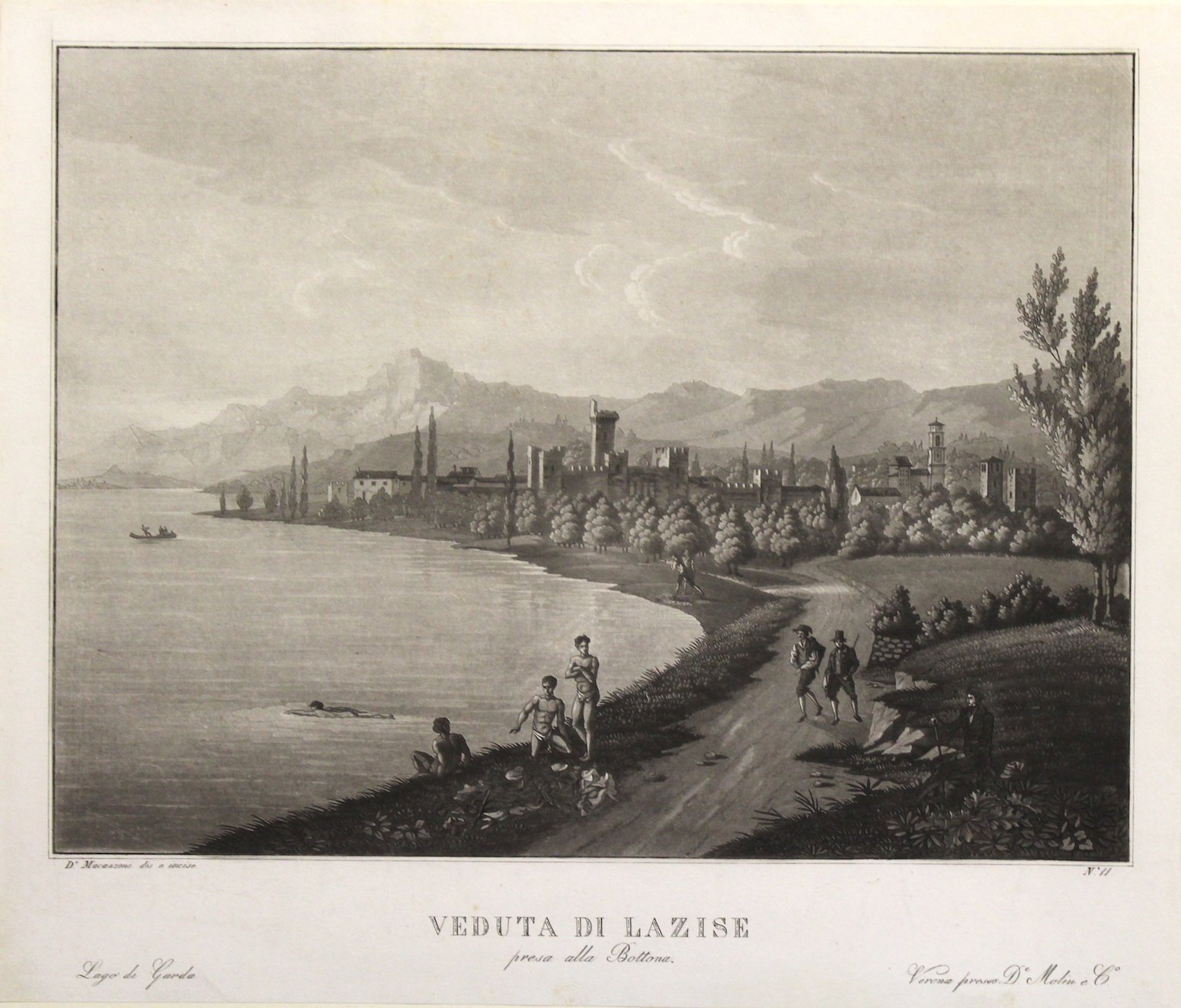 Acquatinta, mm 350x410 (lastra), incisa su proprio soggetto da Macanzoni, noto pittore veronese (1803-1873) figlio d'arte, che fu autore di importanti dipinti di genere vedutistico; da questi fu tratta l'importante serie di 12 stampe, dalla quale è tratta la presente. Questa serie di vedute si può considerare pari per importanza e rarità alla più celebre serie di Wetzel, precedente ma senza dubbio meno rara.<BR>Macanzoni fu avviato dal padre Lodovico, anche lui pittore, al vedutismo. <BR>La sua attività fu piuttosto limitata in quanto egli si dedicò particolarmente al restauro di antichi dipinti, cfr. "Il Garda nelle stampe". Splendido esemplare rifilato alla battuta della lastra <BR><BR>