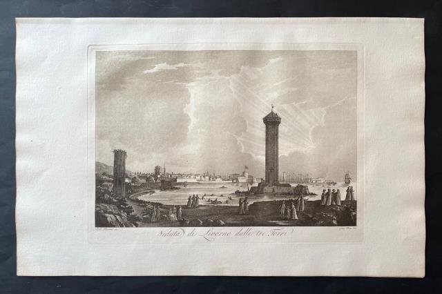 Dal “Viaggio Pittorico della Toscana” di Francesco Fontani, pubblicato per la prima volta a Firenze dall'editore Giuseppe Tofani, tra il 1801 e il 1803. Incisione in rame all'acquatinta disegnata da Antonio Terreni e incisa da Giuseppe Pera, b/n, cm 26 x 36 (alla lastra) più ampi margini. L'opera è considerata uno dei più importanti e suggestivi libri figurati sulla Toscana, sia per la qualità grafica delle incisioni, sia per la grande quantità delle località ritratte. Nei tre volumi in folio che compongono questa ponderosa pubblicazione sono infatti inserite duecentonove tavole, finemente incise all'acquatinta e stampate a inchiostro bruno dai fratelli Antonio e Jacopo Terreni (attivi a Livorno e Firenze tra la fine del diciottesimo e l'inizio del diciannovesimo secolo), da Giovanni Pera e da altri. Nove di queste tavole sono stampate a doppia pagina, raffigurando la carta della regione, una pianta e la veduta delle città principali: Firenze, Siena, Pisa, Livorno; tutte le altre sono stampate a foglio singolo e raffigurano architetture o paesaggi relativi sia alle principali località che ai centri minori della Toscana. Notevole fu il successo del “Viaggio Pittorico della Toscana”, anche per il seguito di riproduzioni e di rifacimenti cui fu sottoposto il suo corredo grafico, in Italia e all'estero. Moltissimi altri libri furono infatti illustrati in seguito con incisioni derivanti dalla grafica dei fratelli Terreni, mentre una seconda edizione dell'opera venne alla luce, in formato ridotto, tra il 1817 e il 1818. Ottimo esemplare.