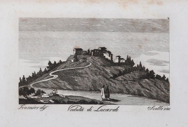 Veduta tratta dal celebre "Il viaggio pittorico della Toscana", stampato a Firenze, per Giovanni Marenigh, 1817.Celebre opera che costituisce uno straordinario affresco iconografico dell'intera Toscana. L'abate Francesco Fontani (Firenze, 1748-1818), dotto erudito, dopo gli studi compiuti nel seminario del Collegio Eugeniano si trasferì a Roma ove insegnò eloquenza nel Collegio Bandinelli. Si dedicò agli studi artistici e archeologici e, rientrato a Firenze, divenne Bibliotecario alla Riccardiana, occupandosi anche della Accademia della Crusca. Fu parroco nella chiesa di Santa Lucia dei Magnoli. "Il viaggio pittorico della Toscana" costuisce la sua opera più rinomata.Riproducendo fedelmente le tavole incise dai fratelli Terreni durante il loro viaggio del 1801,fu pubblicata la prima volta tra il 1801 e il 1803 per i tipi del Tofani a Firenze e in seguito, in questa versione ridotta nel formato, da Giovanni Marenigh nel 1817-1818 e nel 1822. Veduta tratta dal celebre "Il viaggio pittorico della Toscana", stampato a Firenze, per Giovanni Marenigh, 1817.Celebre opera che costituisce uno straordinario affresco iconografico dell'intera Toscana. L'abate Francesco Fontani (Firenze, 1748-1818), dotto erudito, dopo gli studi compiuti nel seminario del Collegio Eugeniano si trasferì a Roma ove insegnò eloquenza nel Collegio Bandinelli. Si dedicò agli studi artistici e archeologici e, rientrato a Firenze, divenne Bibliotecario alla Riccardiana, occupandosi anche della Accademia della Crusca. Fu parroco nella chiesa di Santa Lucia dei Magnoli. "Il viaggio pittorico della Toscana" costuisce la sua opera più rinomata.Riproducendo fedelmente le tavole incise dai fratelli Terreni durante il loro viaggio del 1801,fu pubblicata la prima volta tra il 1801 e il 1803 per i tipi del Tofani a Firenze e in seguito, in questa versione ridotta nel formato, da Giovanni Marenigh nel 1817-1818 e nel 1822. Cfr. Fossati Bellani, II, 3377; Lozzi, 5462, Bigazzi, 1341 e 1342, cita le edizioni 1801-1803 e 1817.
