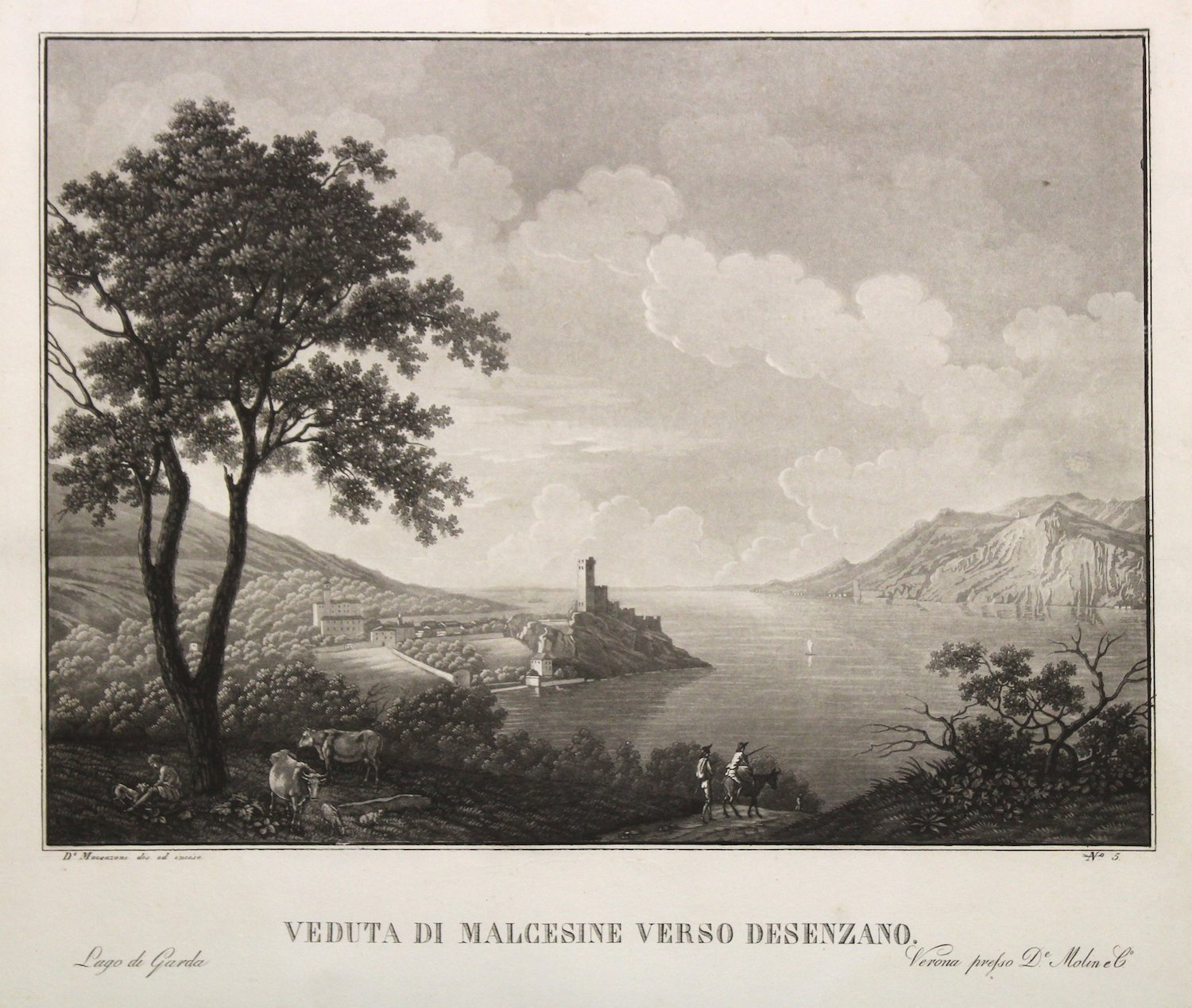Acquatinta, mm 350x410 (lastra), incisa su proprio soggetto da Macanzoni, noto pittore veronese (1803-1873) figlio d'arte, che fu autore di importanti dipinti di genere vedutistico; da questi fu tratta l'importante serie di 12 stampe, dalla quale è tratta la presente. Questa serie di vedute si può considerare pari per importanza e rarità alla più celebre serie di Wetzel, precedente ma senza dubbio meno rara.<BR>Macanzoni fu avviato dal padre Lodovico, anche lui pittore, al vedutismo. <BR>La sua attività fu piuttosto limitata in quanto egli si dedicò particolarmente al restauro di antichi dipinti, cfr. "Il Garda nelle stampe". Splendido esemplare rifilato alla battuta della lastra <BR><BR>