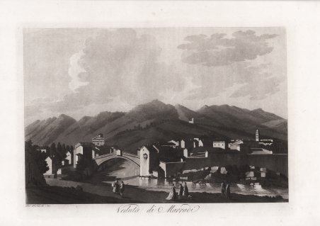 Veduta tratta dalla serie Viaggio pittorico della Toscana di Francesco Fontani fu pubblicato per la prima volta a Firenze, dall’editore Giuseppe Tofani, tra il 1801 ed il 1803. L’opera è considerata uno dei più importanti e suggestivi libri figurati sulla Toscana, sia per la qualità grafica delle incisioni sia per la gran quantità di località ritratte. Nei tre volumi in folio che compongono questa ponderosa pubblicazione sono, infatti, inserite 209 tavole, finemente incise all’acquatinta dai fratelli Antonio e Jacopo Terreni (attivi a Livorno e Firenze tra la fine del diciottesimo e l’inizio del diciannovesimo secolo), da Giovanni Pera ed altri. Nove delle tavole della serie sono stampate a doppia pagina e raffigurano: la carta della regione, una pianta e la veduta delle città principali: Firenze, Siena, Pisa, Livorno. Tutti gli altri esemplari sono stampati a foglio singolo e raffigurano architetture o paesaggi relativi sia alle principali località sia ai centri minori della Toscana. Notevole fu il successo del Viaggio Pittorico della Toscana, anche per il seguito di riproduzioni e di rifacimenti cui fu sottoposto, in Italia e all’estero, gran parte del suo corredo grafico. Moltissimi altri libri furono, infatti, illustrati in seguito con incisioni derivanti dalla grafica dei fratelli Terreni, mentre una seconda edizione dell’opera venne alla luce, in formato ridotto, nel 1817/18. ' Incisione in rame all’acquatinta, stampata ad inchiostro bruno su carta vergata coeva, ampli margini, lievissime bruniture, nel complesso in ottimo stato di conservazione. View taken from Viaggio pittorico della Toscana by Francesco Fontani was published for the first time in Florence by the publisher Giuseppe Tofani, between 1801 and 1803. The work is considered one of the most important and suggestive pictorial books on Tuscany, both for the graphic quality of the engravings and for the large number of places portrayed. In the three folio volumes there are 209 plates, finely etched in aquatint by the brothers Antonio and Jacopo Terreni (active in Livorno and Florence between the end of the eighteenth and the beginning of the nineteenth century), by Giovanni Pera and others. Nine of the plates in the series are printed double-page and depict the map of the region, a plan and a view of the main cities: Florence, Siena, Pisa, Livorno. All other plates are printed on single sheet and depict architecture or landscapes related to both major locations and minor centers of Tuscany. The success of Viaggio Pittorico della Toscana was remarkable, also because of the many reproductions and remakes to which most of its graphic material was subjected, in Italy and abroad. Many other books were, in fact, later illustrated with engravings deriving from the graphics of the Terreni brothers, while a second edition of the work came to light, in a reduced format, in 1817/18. ' Aquatint engraving, printed in brown ink on coeval laid paper, wide margins, very slight browning, overall in very good condition. Cfr. Cremonini pp. 145/148, 181.