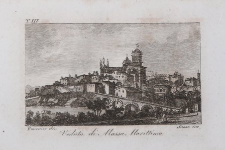 Veduta tratta dal celebre "Il viaggio pittorico della Toscana", stampato a Firenze, per Giovanni Marenigh, 1817.Celebre opera che costituisce uno straordinario affresco iconografico dell'intera Toscana. L'abate Francesco Fontani (Firenze, 1748-1818), dotto erudito, dopo gli studi compiuti nel seminario del Collegio Eugeniano si trasferì a Roma ove insegnò eloquenza nel Collegio Bandinelli. Si dedicò agli studi artistici e archeologici e, rientrato a Firenze, divenne Bibliotecario alla Riccardiana, occupandosi anche della Accademia della Crusca. Fu parroco nella chiesa di Santa Lucia dei Magnoli. "Il viaggio pittorico della Toscana" costuisce la sua opera più rinomata.Riproducendo fedelmente le tavole incise dai fratelli Terreni durante il loro viaggio del 1801,fu pubblicata la prima volta tra il 1801 e il 1803 per i tipi del Tofani a Firenze e in seguito, in questa versione ridotta nel formato, da Giovanni Marenigh nel 1817-1818 e nel 1822. Veduta tratta dal celebre "Il viaggio pittorico della Toscana", stampato a Firenze, per Giovanni Marenigh, 1817.Celebre opera che costituisce uno straordinario affresco iconografico dell'intera Toscana. L'abate Francesco Fontani (Firenze, 1748-1818), dotto erudito, dopo gli studi compiuti nel seminario del Collegio Eugeniano si trasferì a Roma ove insegnò eloquenza nel Collegio Bandinelli. Si dedicò agli studi artistici e archeologici e, rientrato a Firenze, divenne Bibliotecario alla Riccardiana, occupandosi anche della Accademia della Crusca. Fu parroco nella chiesa di Santa Lucia dei Magnoli. "Il viaggio pittorico della Toscana" costuisce la sua opera più rinomata.Riproducendo fedelmente le tavole incise dai fratelli Terreni durante il loro viaggio del 1801,fu pubblicata la prima volta tra il 1801 e il 1803 per i tipi del Tofani a Firenze e in seguito, in questa versione ridotta nel formato, da Giovanni Marenigh nel 1817-1818 e nel 1822. Cfr. Fossati Bellani, II, 3377; Lozzi, 5462, Bigazzi, 1341 e 1342, cita le edizioni 1801-1803 e 1817.