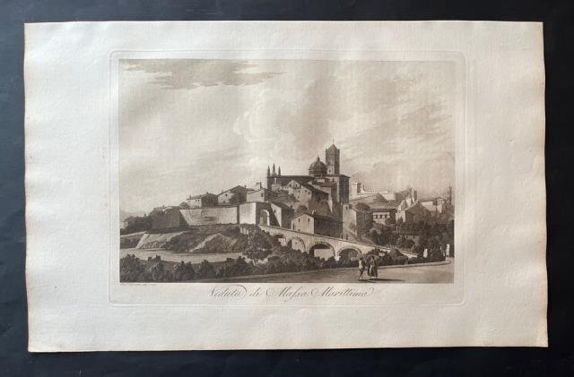 Dal “Viaggio Pittorico della Toscana” di Francesco Fontani, pubblicato per la prima volta a Firenze dall'editore Giuseppe Tofani, tra il 1801 e il 1803. Incisione in rame all'acquatinta disegnata e inicisa da Antonio Terreni, b/n, cm 26 x 36 (alla lastra) più ampi margini. L'opera è considerata uno dei più importanti e suggestivi libri figurati sulla Toscana, sia per la qualità grafica delle incisioni, sia per la grande quantità delle località ritratte. Nei tre volumi in folio che compongono questa ponderosa pubblicazione sono infatti inserite duecentonove tavole, finemente incise all'acquatinta e stampate a inchiostro bruno dai fratelli Antonio e Jacopo Terreni (attivi a Livorno e Firenze tra la fine del diciottesimo e l'inizio del diciannovesimo secolo), da Giovanni Pera e da altri. Nove di queste tavole sono stampate a doppia pagina, raffigurando la carta della regione, una pianta e la veduta delle città principali: Firenze, Siena, Pisa, Livorno; tutte le altre sono stampate a foglio singolo e raffigurano architetture o paesaggi relativi sia alle principali località che ai centri minori della Toscana. Notevole fu il successo del “Viaggio Pittorico della Toscana”, anche per il seguito di riproduzioni e di rifacimenti cui fu sottoposto il suo corredo grafico, in Italia e all'estero. Moltissimi altri libri furono infatti illustrati in seguito con incisioni derivanti dalla grafica dei fratelli Terreni, mentre una seconda edizione dell'opera venne alla luce, in formato ridotto, tra il 1817 e il 1818. Ottimo esemplare.