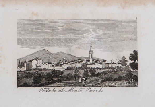 Veduta tratta dal celebre "Il viaggio pittorico della Toscana", stampato a Firenze, per Giovanni Marenigh, 1817.Celebre opera che costituisce uno straordinario affresco iconografico dell'intera Toscana. L'abate Francesco Fontani (Firenze, 1748-1818), dotto erudito, dopo gli studi compiuti nel seminario del Collegio Eugeniano si trasferì a Roma ove insegnò eloquenza nel Collegio Bandinelli. Si dedicò agli studi artistici e archeologici e, rientrato a Firenze, divenne Bibliotecario alla Riccardiana, occupandosi anche della Accademia della Crusca. Fu parroco nella chiesa di Santa Lucia dei Magnoli. "Il viaggio pittorico della Toscana" costuisce la sua opera più rinomata.Riproducendo fedelmente le tavole incise dai fratelli Terreni durante il loro viaggio del 1801,fu pubblicata la prima volta tra il 1801 e il 1803 per i tipi del Tofani a Firenze e in seguito, in questa versione ridotta nel formato, da Giovanni Marenigh nel 1817-1818 e nel 1822. Veduta tratta dal celebre "Il viaggio pittorico della Toscana", stampato a Firenze, per Giovanni Marenigh, 1817.Celebre opera che costituisce uno straordinario affresco iconografico dell'intera Toscana. L'abate Francesco Fontani (Firenze, 1748-1818), dotto erudito, dopo gli studi compiuti nel seminario del Collegio Eugeniano si trasferì a Roma ove insegnò eloquenza nel Collegio Bandinelli. Si dedicò agli studi artistici e archeologici e, rientrato a Firenze, divenne Bibliotecario alla Riccardiana, occupandosi anche della Accademia della Crusca. Fu parroco nella chiesa di Santa Lucia dei Magnoli. "Il viaggio pittorico della Toscana" costuisce la sua opera più rinomata.Riproducendo fedelmente le tavole incise dai fratelli Terreni durante il loro viaggio del 1801,fu pubblicata la prima volta tra il 1801 e il 1803 per i tipi del Tofani a Firenze e in seguito, in questa versione ridotta nel formato, da Giovanni Marenigh nel 1817-1818 e nel 1822. Cfr. Fossati Bellani, II, 3377; Lozzi, 5462, Bigazzi, 1341 e 1342, cita le edizioni 1801-1803 e 1817.