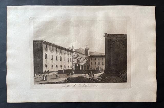 Dal “Viaggio Pittorico della Toscana” di Francesco Fontani, pubblicato per la prima volta a Firenze dall'editore Giuseppe Tofani, tra il 1801 e il 1803. Incisione in rame all'acquatinta disegnata e incisa da Antonio Terreni, b/n, cm 26 x 36 (alla lastra) più ampi margini. L'opera è considerata uno dei più importanti e suggestivi libri figurati sulla Toscana, sia per la qualità grafica delle incisioni, sia per la grande quantità delle località ritratte. Nei tre volumi in folio che compongono questa ponderosa pubblicazione sono infatti inserite duecentonove tavole, finemente incise all'acquatinta e stampate a inchiostro bruno dai fratelli Antonio e Jacopo Terreni (attivi a Livorno e Firenze tra la fine del diciottesimo e l'inizio del diciannovesimo secolo), da Giovanni Pera e da altri. Nove di queste tavole sono stampate a doppia pagina, raffigurando la carta della regione, una pianta e la veduta delle città principali: Firenze, Siena, Pisa, Livorno; tutte le altre sono stampate a foglio singolo e raffigurano architetture o paesaggi relativi sia alle principali località che ai centri minori della Toscana. Notevole fu il successo del “Viaggio Pittorico della Toscana”, anche per il seguito di riproduzioni e di rifacimenti cui fu sottoposto il suo corredo grafico, in Italia e all'estero. Moltissimi altri libri furono infatti illustrati in seguito con incisioni derivanti dalla grafica dei fratelli Terreni, mentre una seconda edizione dell'opera venne alla luce, in formato ridotto, tra il 1817 e il 1818. Ottimo esemplare.