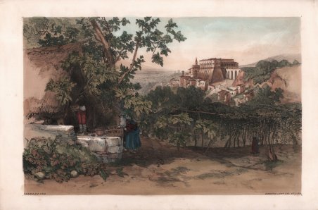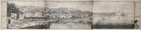 Monumentale veduta della città incisa da Ignazio Sclopis e dedicata alla viscontessa Georgiana Spencer, nome con il quale viene spesso identificata. La tavola, stampata su tre lastre, costituisce il paio con il Prospetto generale di Napoli, la classica veduta della città dal mare. Le “Spencer” costituisco le più importanti vedute per misura ed impegno sulla città. “Le due vedute dedicate alla viscontessa Spencer si svolgono su tre grandi rami ciascuna, con la stessa altezza e una differenza di circa venti centimetri di lunghezza tra le due. La più piccola, con la veduta di Posillipo, mostra l’intero prospetto della riviera di Chiaia, di grandissimo interesse per questa parte della città, successivamente molto trasformata. È in tal senso singolare che uno dei prospetti più importanti della città non abbia mai ricevuto una sistemazione progettuale unitaria, conservandosi invece quel pittoresco, ma talvolta anche trito alternarsi di facciatine, tipico di una edilizia stratificata. Tra gli edifici, tutti minutamente delineati, spiccano la chiesa e il convento di S. Antonio a Posillipo con la rampa che conduce alla grotta di Posillipo, il fanzaghiano palazzo Teora Mirelli, le chiese di S. Maria della Neve, di S. Giuseppe con la facciata primitiva, di S. Maria della Vittoria con le cupole e la facciata primitive, oltre i numerosi palazzi patrizi. In primo piano si svolge inoltre una vivace scena di costume, con cavalieri, carrozze, tarantelle improvvisate bisticci, scena di pesca ed il via vai delle imbarcazioni dirette a Posillipo, che prendono terra proprio sulla spiaggia della Torretta. La veduta ha 66 riferimenti nei due cartigli laterali, ne quali è ricordata anche la recente eruzione del Vesuvio. La seconda, maggiore veduta copre, com’era ormai tradizione, tutto l'arco dalla punta di Posillipo al ponte della Maddalena. Essa ospita 68 riferimenti tipografici nel lungo cartiglio inferiore, corredato di raffigurazioni mitologiche. Anche qui, ma forse in maggior misura che nell'altra, la descrizione minuta del tessuto edilizio, decisamente topografico-vedutistica, è di prezioso ausilio per la ricostruzione dell'aspetto dei luoghi e per la storia del costume. Accenniamo soltanto, rinviando ad una specifica futura illustrazione, all'aspetto del borgo di S. Lucia, con il baluardo, le fontane sul prospetto del mare ed il casino Carafa, con il complesso della Croce di Palazzo e l'Arsenale seicentesco ancora in piedi; oppure al prospetto urbano sul porto, con i bassi edifici a due piani destinati ad uffici doganali ed amministrativi, l'edificio della Dogana della farina, già parzialmente modificato, l'Immacolatella di contro al Mandracchio - come si era chiamato, con tardivo grecismo, il porto interno o Molo piccolo, ora chiuso da un ponte (« Pontenuovo ») per la nuova strada Marina; o ancora le innumerevoli abitazioni improprie, magazzini e rimesse di imbarcazioni presenti lungo il prospetto successivo, a coprire le mura urbane, come già aveva anticipato la veduta Baratta ai primi del Seicento. Qua e là, oltre ad edifici molto bassi, si osservano anche edifici di sei piani. Sulla collina spicca la fabbrica del palazzo Reale di Capodimonte, da pochi anni sede del Musco farnesiano e, sempre sullo sfondo, in basso, al di là della ' selva di cupole e campanili della città antica, si riconosce la lunga mole dell'Albergo dei Poveri, in costruzione. Sul mare sfilano le barche con gli ordigni per la pesca a strascico. Anche qui la scena è animatissima; l'affollamento di imbarcazioni, con tutto il loro ingombrante corredo -oltre che nel porto anche lungo la spiaggia della Marina, recentemente sistemata da Carlo di Borbone – è talmente parte della città che, si può dire, difficilmente l'autore avrebbe potuto esimersi dal delinearlo, se anche avesse voluto” (cfr. Giulio Pane, in La città di Napoli tra vedutismo e Cartografia, pp. 251/253, 109. Nella veduta di Chiaia, al centro della foto si vede anche . Monumental view of the city engraved by Ignazio Sclopis and dedicated to the Viscountess Georgiana Spencer, the name by which it's often identified. The "Spencer" are the most important views of the city for their size and commitment. The two views dedicated to Viscountess Spencer take place on three large branches each, with the same height and a difference of about twenty inches in length between them. The smaller one, with the view of Posillipo, shows the entire elevation of the Riviera di Chiaia, of great interest to this part of the city, subsequently much transformed. It is in this sense singular that one of the most important elevations of the city has never received a unitary project arrangement, preserving instead that picturesque, but sometimes trite alternation of facades, typical of a stratified building. Among the buildings, all minutely outlined, stand out the church and the convent of S. Antonio a Posillipo with the ramp leading to the cave of Posillipo, the Fanzago palace Teora Mirelli, the churches of S. Maria della Neve, S. Giuseppe with the primitive facade, S. Maria della Vittoria with the domes and the primitive facade, as well as numerous patrician palaces. In the foreground there is also a lively scene of costume, with knights, carriages, tarantella improvised bickering, fishing scene and the comings and goings of the boats bound for Posillipo, which take land right on the beach of the Torretta. The view has 66 references in the two lateral cartouches, in which the recent eruption of Vesuvius is also remembered. The second, larger view covers, as was now tradition, the entire arc from the tip of Posillipo to the bridge of La Maddalena. It has 68 typographical references in the long lower scroll, accompanied by mythological representations. Here too, but perhaps to a greater extent than in the other, the minute description of the building fabric, decidedly topographical-vedutistic, is of precious help in reconstructing the appearance of places and th