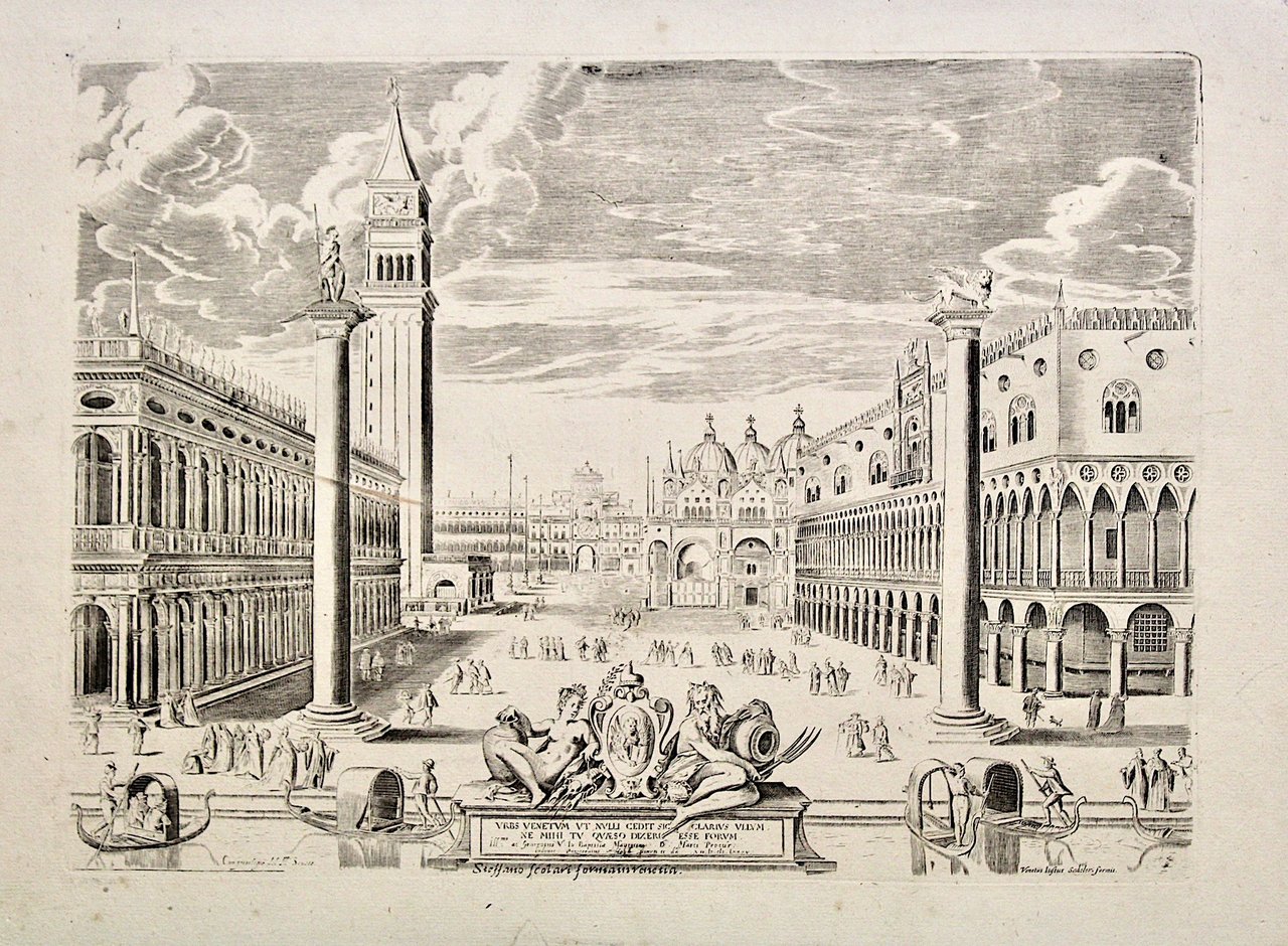 Incisione in rame, mm 310x425. Veduta della piazzetta verso la Basilica; al centro ricca scena allegorica con Venezia incoronata con la dea Diana e Mercurio. In basso a destra firma in lastra “Venetus Justus Sadeler formis” mentre al centro “Steffano Scolari forma in Venetia” evidentemente aggiunto. Esemplare marginoso e ben conservato. Impressione di stampa abbastanza leggera, come usuale in questa tiratura di Scolari. Stato II/II. Copper engraving, mm 310x425. View of the Piazzetta towards the Basilica; rich allegorical scene with Venice crowned with Diana and Mercurius. Signed "Venetus Justus Sadeler formis" and "Steffano Scolari forma in Venetia". Good condition. Tipical light Scolari impression on wove paper. State II/II