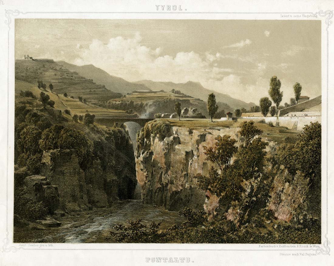 Litografia a colori di dimensioni 213x290 mm. Condizioni : USATO - Stato : Buono, ordinari segni d'uso e del tempo. Altre note : Veduta del ponte Alto sul torrente Fersina, sulla strada per la Valsugana. Scheda bibliografica tratta da "Il Trentino-Alto Adige: immagini dal passato" di Dal Lago Veneri Brunamaria e Loner Arnaldo, scheda n. 89 pagg. 208 e 209. Si vende in cornice. Disponibile altra copia refilata per 150 euro.