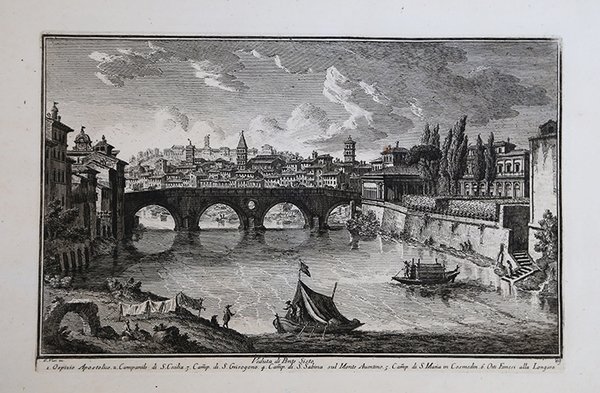 Veduta tratta dalla monumentale opera ' Delle magnificenze di Roma antica e moderna.Pubblicata in 10 volumi dal 1747 al 1761, l’opera presenta 238 incisioni in rame, ciascuna incisione con testo narrativo che fornisce informazioni storiche e documentarie. ' Conosciuto dai più semplicemente come il "maestro" di Giovanni Battista Piranesi, Giuseppe Vasi rivela in quest'opera monumentale la pienezza della sua creatività grafica. I 10 libri che la compongono hanno ognuno un frontespizio con titolo e data diversi: ' Libro primo che contiene le porte e mura; Libro secondo, che contiene le piazze principali di Roma con obelischi, colonne, ed altri ornamenti; Libro terzo, che contiene le basiliche e chiese antiche di Roma; Libro quarto che contiene i palazzi e le vie più celebri; Libro quinto che contiene i ponti e gli edifizj sul Libro sesto che contiene la chiese parrocchiali; Libro settimo che contiene i conventi e case dei chierici regolari; Libro ottavo che contiene i monasteri e conservatorj di donne; Libro nono che contiene i collegj, spedali, e luoghi pii; decimo che contiene le ville e giardini più rimarchevoli. Le ' Magnificenze ' forniscono un panorama completo e al tempo stesso anticonvenzionale dell'Urbe: così, insieme alle consuete, celeberrime inquadrature desunte dalla migliore tradizione vedutistica, si trova anche una Roma insolita, quella che, talvolta, non esiste più. A quest'opera, di centrale importanza nell'editoria romana di metà Settecento, l'Autore aveva lavorato per quasi un ventennio realizzando una monumentale guida dell'Urbe dove accanto alle consuete e celeberrime inquadrature tratte dalla migliore tradizione vedutistica, immortala anche scorci insoliti che sono poi scomparsi con il cambiare della città. Il testo che accompagna le vedute nel primo volume è opera di Giuseppe Bianchini, nel secondo di Orazio Orlandi e nei restanti del Vasi stesso. A partire dall'edizione del 1786, l'opera del Vasi, fu aggiornata dal figlio Mariano, che la pubblicò col titolo ' Raccolta delle più belle vedute antiche, e moderne di Roma, mostrando solo il nome del padre come autore. Questa nuova edizione presentava molte tavole della prima edizione, ed alcune nuove. Anche la pubblicazione di Mariano Vasi fu stampata più volte, sempre con l’aggiunta di nuove tavole. Esemplare tratto dall'edizione del 1786. Acquaforte, stampata su carta vergata coeva, completa dei margini, in ottimo stato di conservazione. ' View taken from the monumental work ' Delle magnificenze di Roma antica e moderna. Published in 10 volumes from 1747 to 1761, the work features 238 copper engravings, each engraving with a narrative text that provides historical and documentary information. Known by most simply as the "master" of Giovanni Battista Piranesi, Giuseppe Vasi reveals in this monumental work the fullness of his graphic creativity. The 10 books that compose it each have a title page with a different title and date: ' Libro primo che contiene le porte e mura; Libro secondo, che contiene le piazze principali di Roma con obelischi, colonne, ed altri ornamenti; Libro terzo, che contiene le basiliche e chiese antiche di Roma; Libro quarto che contiene i palazzi e le vie più celebri; Libro quinto che contiene i ponti e gli edifizj sul Libro sesto che contiene la chiese parrocchiali; Libro settimo che contiene i conventi e case dei chierici regolari; Libro ottavo che contiene i monasteri e conservatorj di donne; Libro nono che contiene i collegj, spedali, e luoghi pii; decimo che contiene le ville e giardini più rimarchevoli. The ' Magnificences ' provide a complete and at the same time unconventional panorama of the City: thus, together with the usual, celebrated shots taken from the best tradition of ' vedutistica, one also finds an unusual Rome, one that, at times, no longer exists. The author had worked on this work, of central importance in Roman publishing in the middle of the eighteenth century, for almost twenty years, producing a monumental guide to the “Urbe” where, alongside the usual and famous shots taken from the best tradition of ' vedutistica, he also immortalized unusual views that have since disappeared with the change of the city. The text that accompanies the views in the first volume is by Giuseppe Bianchini, in the second by Orazio Orlandi and in the remaining ones by Vasi himself. Starting from the edition of 1786, the work of Vasi, was updated by his son Mariano, who published it under the title ' Raccolta delle più belle vedute antiche, e moderne di Roma, showing only the name of his father as author. This new edition presented many plates of the first edition, and some new ones. The publication of Mariano Vasi was also printed several times, always with the addition of new plates. ' View taken from 1786 edition of the Vasi’s ' Delle Magnificenze di Roma Antica e Moderna. Etching, printed on contemporary laid paper, in very good condition. Cfr.