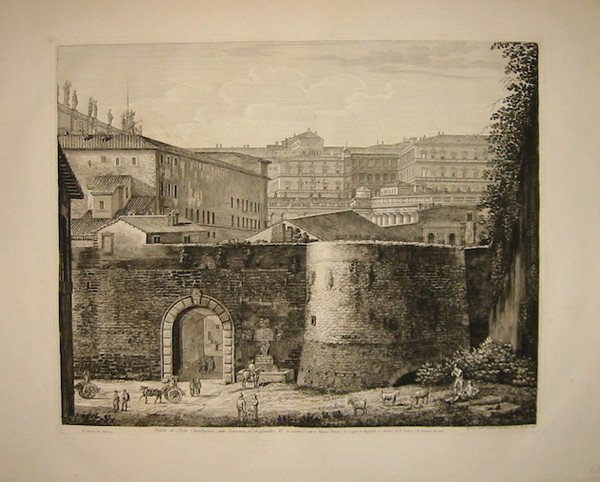 Incisione originale su rame (cm. 50x41 più ampi margini bianchi) tratta da ‘Le Porte antiche e moderne del Recinto di Roma con le Mura, Prospetti e Piante geometriche’. Ottimo esemplare. Rara.