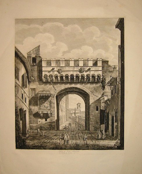 Incisione originale su rame (cm. 41x50 più ampi margini bianchi) tratta da ‘Le Porte antiche e moderne del Recinto di Roma con le Mura, Prospetti e Piante geometriche’. Ottimo esemplare. Rara.