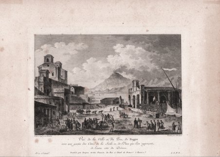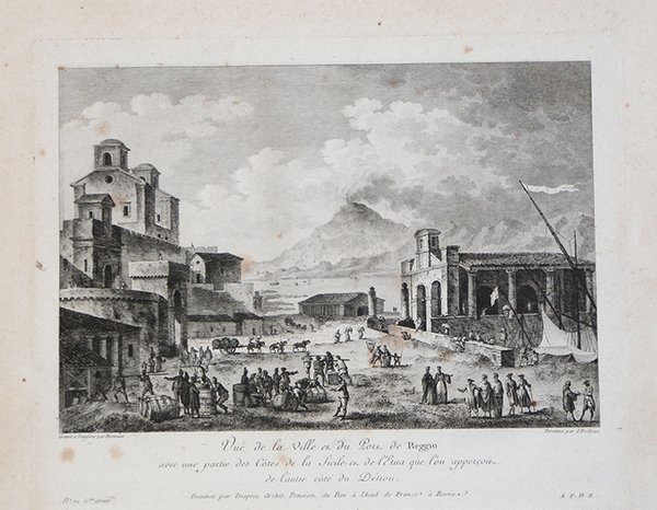 Veduta pubblicata nel ' Voyage Pittoresque ou description des Royaumes de Naples et de Sicile, opera in 5 volumi per la prima volta stampati a Parigi tra 1781 e il 1786. Richard de Saint-Non conobbe, durante il suo viaggio a Roma, i due già celebri pittori francesi Jean Honoré Fragonard e Hubert Robert, con i quali prosegue il suo viaggio per tutto il paese. Da questa grande amicizia nasce l’idea e la collaborazione per l’ambizioso progetto di documentare graficamente tutti i principali monumenti dell’Italia Meridionale e della Sicilia. Da qui, tra il 1781 ed il 1786, con l’aiuto di numerosi ed importanti architetti, pittori ed incisori, venne alla luce il Voyage Pittoresque ou description des Royaume de Naples et de Sicilie, opera composta di cinque volumi che uscirono annualmente. Incredibile sforzo tipografico, l’opera raccoglie quasi per intero gli appunti di viaggio del Saint-Non, adeguatamente assemblati e corretti; il corpus grafico è composto di ben 542 incisioni all’acquaforte e bulino, opera dei principali artisti di riproduzione del periodo. Da un punto di vista editoriale l’iniziativa riscuote immediatamente un grandissimo successo: il libro diviene un vero e proprio modello tipografico, sul quale sono basate diverse pubblicazioni dell’impero napoleonico. Dal punto di vista artistico le vedute, i paesaggi e le rovine conservano, e non può essere altrimenti, lo stile pittorico e romantico del Fragonard, del Robert, del Desprez, e di tutti gli altri artisti che collaborano nella realizzazione di questa monumentale opera. Il notevole successo commerciale della raccolta è testimoniato dalla ristampa, tra il 1795 ed il 1798, delle sole tavole pittoriche. Un’ulteriore edizione è stampata nel 1829 dal Dufour. Esemplare tratto dal ' Voyage Pittoresque, ' prima edizione con l’acronimo del privilegio reale. ' Acquaforte, stampata su carta vergata coeva, leggere ossidazioni, per il resto in ottimo stato di conservazione. View taken from the Voyage Pittoresque ou description des Royaume de Naples et de Sicilie by Richard de Saint-Non. During his trip to Rome, Richard de Saint-Non met two already famous French painters, Jean Honoré Fragonard and Hubert Robert, with whom he travelled along Italy. Their friendship led to the cooperation for the ambitious project of depicting all the main monuments of Southern Italy and Sicily. Between 1781 and 1786, with the assistance of many contemporary artists, he realized the Voyage Pittoresque ou description des Royaume de Naples et de Sicilie, a five volumes work published annually. As a result of a great typographical effort, the work is a collection of Sain-Non’s travelling notes; the graphic part is made up of 542 engravings and etchings, realized by the most important artists of the period. The work is immediately successful, for the book became a new typographical model for the following publications. From an artistic point of view, the views, landscapes and antiquity keep the Romantic pictorial style of Fragonard, Robert, Desprez and all the other artists that took part in this monumental project. The re-issue, between 1795 and 1798, of the pictorial plates, witnesses the great success of this project. A re-issue of the whole work was edited in 1829 by Dufour. Example taken from the first edition of the work, with the acronym of the Royal priviledge. ' Etching, printed on contemporary laid paper, light foxing, otherwise good condition. Cfr.