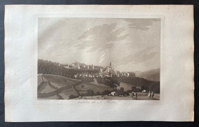 Dal “Viaggio Pittorico della Toscana” di Francesco Fontani, pubblicato per la prima volta a Firenze dall'editore Giuseppe Tofani, tra il 1801 e il 1803. Incisione in rame all'acquatinta disegnata e incisa da Antonio Terreni, b/n, cm 26 x 36 (alla lastra) più ampi margini. L'opera è considerata uno dei più importanti e suggestivi libri figurati sulla Toscana, sia per la qualità grafica delle incisioni, sia per la grande quantità delle località ritratte. Nei tre volumi in folio che compongono questa ponderosa pubblicazione sono infatti inserite duecentonove tavole, finemente incise all'acquatinta e stampate a inchiostro bruno dai fratelli Antonio e Jacopo Terreni (attivi a Livorno e Firenze tra la fine del diciottesimo e l'inizio del diciannovesimo secolo), da Giovanni Pera e da altri. Nove di queste tavole sono stampate a doppia pagina, raffigurando la carta della regione, una pianta e la veduta delle città principali: Firenze, Siena, Pisa, Livorno; tutte le altre sono stampate a foglio singolo e raffigurano architetture o paesaggi relativi sia alle principali località che ai centri minori della Toscana. Notevole fu il successo del “Viaggio Pittorico della Toscana”, anche per il seguito di riproduzioni e di rifacimenti cui fu sottoposto il suo corredo grafico, in Italia e all'estero. Moltissimi altri libri furono infatti illustrati in seguito con incisioni derivanti dalla grafica dei fratelli Terreni, mentre una seconda edizione dell'opera venne alla luce, in formato ridotto, tra il 1817 e il 1818. Ottimo esemplare.