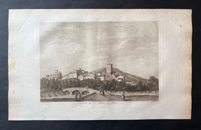 Dal “Viaggio Pittorico della Toscana” di Francesco Fontani, pubblicato per la prima volta a Firenze dall'editore Giuseppe Tofani, tra il 1801 e il 1803. Incisione in rame all'acquatinta disegnata da Antonio Terreni e incisa da Giuseppe Pera, b/n, cm 26 x 36 (alla lastra) più ampi margini. L'opera è considerata uno dei più importanti e suggestivi libri figurati sulla Toscana, sia per la qualità grafica delle incisioni, sia per la grande quantità delle località ritratte. Nei tre volumi in folio che compongono questa ponderosa pubblicazione sono infatti inserite duecentonove tavole, finemente incise all'acquatinta e stampate a inchiostro bruno dai fratelli Antonio e Jacopo Terreni (attivi a Livorno e Firenze tra la fine del diciottesimo e l'inizio del diciannovesimo secolo), da Giovanni Pera e da altri. Nove di queste tavole sono stampate a doppia pagina, raffigurando la carta della regione, una pianta e la veduta delle città principali: Firenze, Siena, Pisa, Livorno; tutte le altre sono stampate a foglio singolo e raffigurano architetture o paesaggi relativi sia alle principali località che ai centri minori della Toscana. Notevole fu il successo del “Viaggio Pittorico della Toscana”, anche per il seguito di riproduzioni e di rifacimenti cui fu sottoposto il suo corredo grafico, in Italia e all'estero. Moltissimi altri libri furono infatti illustrati in seguito con incisioni derivanti dalla grafica dei fratelli Terreni, mentre una seconda edizione dell'opera venne alla luce, in formato ridotto, tra il 1817 e il 1818. Ottimo esemplare.