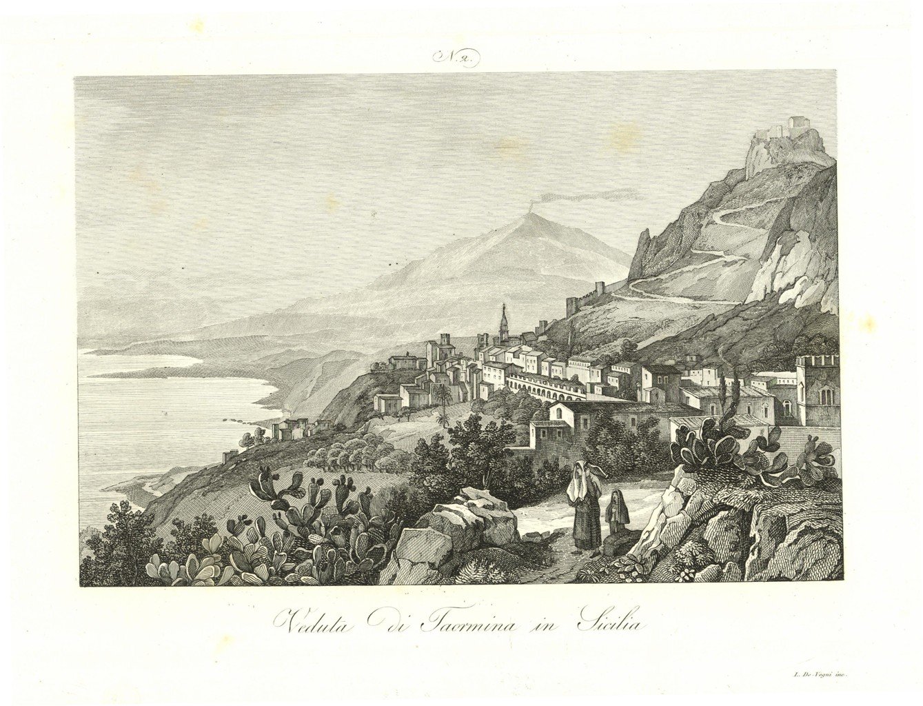 Veduta della città di Taormina ripresa dall'alto. Sullo sfondo si riconosce il profilo dell'Etna ancora fumante. Ottimo stato di conservazione generale