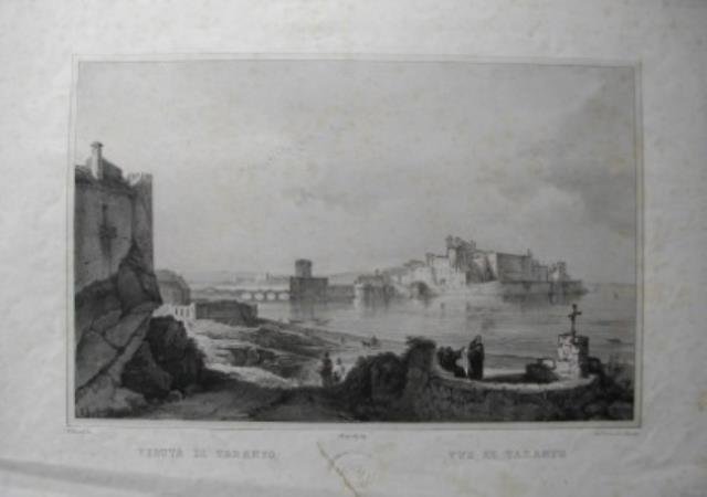 Litografia Cuciniello e Bianchi, 1840 circa. Litografia, b/n, cm 31,5 x 45 (il foglio). Veduta animata del Golfo di Taranto con la città vecchia, animata da figure di cappuccini in primo piano. Un piccolo strappo al margine bianco inferiore, fioriture ai margini, pulito e ben impresso il figurato. .