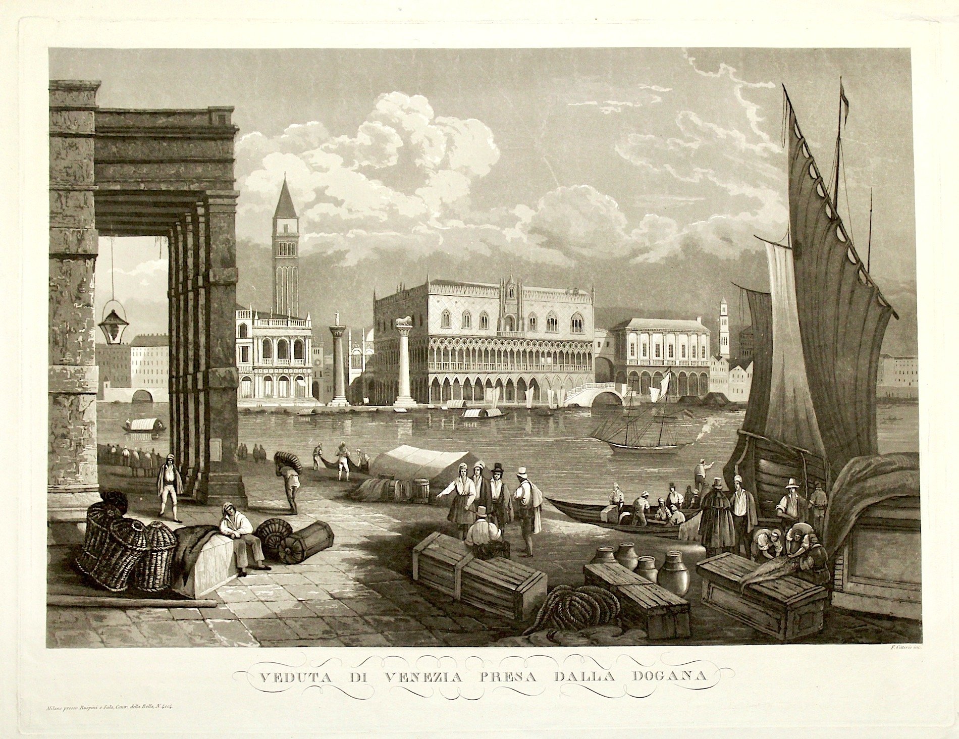 Acquatinta in rame, mm 373x490 (lastra). Bellissima e rara veduta raffigurante una animata scena portuale sulla punta della dogana con palazzo ducale, libreria Marciana e campanile di S. Marco in secondo piano; pubblicata da Ruspini e Sala in Contrada della Bella a Milano. Perfettamente conservata. <BR>