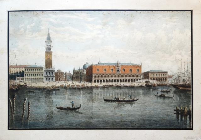 1850 circa. Puntasecca in colore d’epoca, cm 38 x 59 (il foglio). Bella veduta della città, con la Piazza San Marco e le sue adiacenze riprese dalla laguna. Rifilata lungo i margini della parte figurata e uno strappo riparato al margine laterale sinistro, foxing sporadico, nell'insieme in discreto stato e molto decorativa.