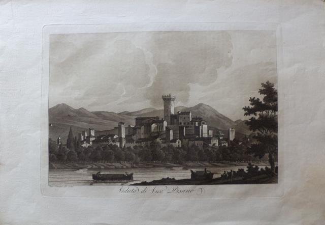 Incisione in rame all’acquatinta, stampata a inchiostro bruno su carta vergata coeva, cm 26,5 x 37 circa (alla lastra). Esemplare in ampi margini e in bella impressione di stampa, ottimo stato di conservazione. l “Viaggio Pittorico della Toscana” di Francesco Fontani, fu pubblicato per la prima volta a Firenze dall’editore Giuseppe Tofani, tra il 1801 e il 1803. L’opera è da considerarsi come uno fra i più importanti e suggestivi libri figurati sulla Toscana, sia per la qualità grafica delle incisioni, sia per la gran quantità delle località ritratte. Nei tre volumi in folio che compongono questa poderosa pubblicazione sono infatti inserite 209 tavole, finemente incise all’acquatinta dai fratelli Antonio e Jacopo Terreni (attivi a Livorno e Firenze tra la fine del diciottesimo e l’inizio del diciannovesimo secolo), da Giovanni Pera e da altri. Nove di queste tavole sono stampate a doppia pagina, tutte le altre sono stampate a foglio singolo e raffigurano architetture o paesaggi relativi sia alle principali località che ai centri minori della Toscana. Grande fu il successo del “Viaggio Pittorico della Toscana”: una seconda edizione dell’opera venne alla luce, in formato ridotto, fra 1817 e il 1818; notevole fu anche il seguito di riproduzioni e di rifacimenti cui l’opera fu sottoposta, in Italia e all’estero, dal momento che molti saranno i libri illustrati con incisioni derivanti dalla grafica dei fratelli Terreni. (Cfr: Cremonini pp. 95, 145, 148, 95, Frati, p. 301).