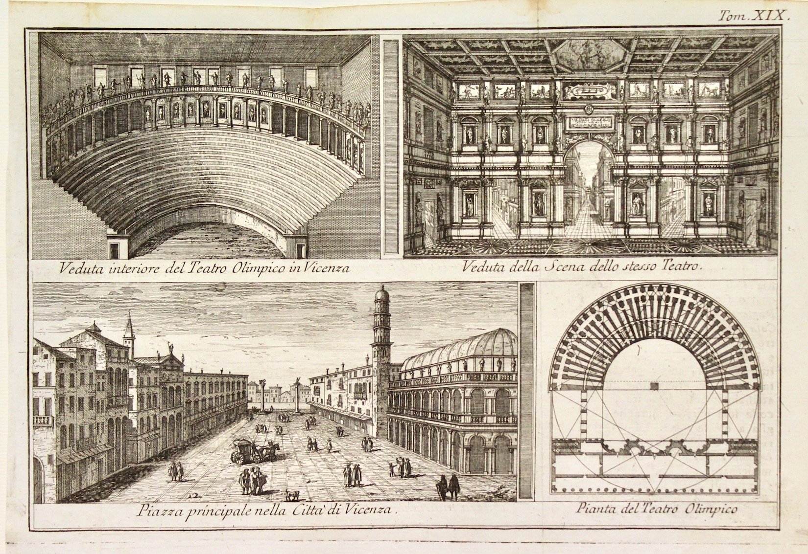 Veduta interiore del Teatro Olimpico in Vicenza-Veduta della scena dello stesso teatro-Piazza principale nella città di Vicenza-Pianta del teatro Olimpico