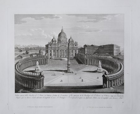 Veduta tratta dall’opera ' Nuova Raccolta delle principali vedute antiche e moderne dell’Alma città di Roma e sue vicinanze, incise a bulino da Pietro ed Achille Parboni e Pietro Ruga l’anno 1830, ' edita da Giacomo Antonelli con imprint ' Roma presso Giacom.o Antonelli in Via del Corso alle Convertite num 179B. Le tavole dell’opera furono incise tra il 1825 e il 1829 da diversi incisori tra i quali i fratelli Parboni e Pietro Ruga. Ciascuna reca il nome dell’incisore, l’indirizzo editoriale e una doppia didascalia in italiano e in francese. Acquaforte, in ottimo stato di conservazione. View taken from the work ' Nuova Raccolta delle principali vedute antiche e moderne dell'Alma città di Roma e sue vicinanze, engraved with engraving by Pietro and Achille Parboni and Pietro Ruga the year 1830, published by Giacomo Antonelli with imprint ' Roma presso Giacom.o Antonelli in Via del Corso alle Convertite num 179B. The plates were engraved between 1825 and 1829 by several engravers including the Parboni brothers and Pietro Ruga. Each bears the engraver's name, editorial address, and a double caption in Italian and French. Etching, in very good condition. Cfr.