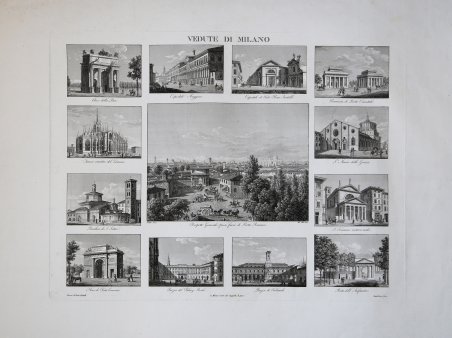 Rara tavola raffigurante vedute di Milano, pubblicata nel 1828 circa dalla tipografia dei fratelli Bettalli (imprint in basso al centro "in Milano Contr. Del Cappello N. 4027") incisa da Caroline von Schlieben Lose, su probabile disegno del marito Friederich Lose.Reca iscritto sotto le vedute:Arco della Pace, Ospedale Maggiore, Ospedale de Frate Bene Fratelli, Barriera di Porta Orientale, S.ta Maria delle Grazie, Fianco sinistra del Duomo, Basilica di S. Satiro, Arco di Porta Comasina, Piazza del Palazzo Reale, Piazza de' Tribunali, Porta dell'Anfiteatro, Prospetto Generale preso fuori di Porta Romana.Friedrich Lohse, allievo del pittore e incisore tedesco Philip Ludwig Oser, e Caroline von Schlieben, figlia di un consigliere di Corte d’appello, cominciarono a frequentarsi durante il loro apprendistato artistico a Dresda, dove furono, per qualche tempo, anche in stretti rapporti di amicizia con il grande scrittore tedesco Heinrich von Kleist, conosciuto durante un suo soggiorno in quella che per i tedeschi era allora la “Firenze del Nord”. Friedrich era probabilmente il secondo nome di Lohse, che a Dresda era conosciuto con quello di Heinrich, in seguito abbandonato. Quando si sposarono lui era già da tempo a Parigi, per perfezionare la sua formazione artistica. E da Parigi partirono nel 1805, al seguito del vicerè del Regno d’Italia Eugenio Beauharnais, alla volta di Milano, dove Friedrich trovò impiego al “Bureau Tipografico francese”, mentre Caroline si adattò inizialmente a cucire decorazioni tessili. Caduto Napoleone e tramontato nel 1814 il Regno d’Italia, i due coniugi decisero di stabilirsi definitivamente a Milano dedicandosi al disegno e all’incisione di vedute urbane e paesistiche lombarde nella loro casa sul Naviglio di contrada S. Damiano 299. Divennero così Federico e Carolina Lose, lui disegnatore, lei incisore e colorista delle sue vedute, due artisti che nella rappresentazione del paesaggio traducevano la visione romantica della natura, assimilata in gioventù sulle pagine di Rousseau. Nel 1815 i loro nomi erano già segnati come collaboratori nei registri degli Artaria e di Francesco Bernucca e all’inizio del 1816 le prime acquetinte disegnate da Federico Lose e incise da Carolina Lose cominciarono a uscire nelle dispense dell’album Le bellezze pittoriche di Milano, pubblicato da Ferdinando Artarìa tra il 1815 e il 1821 e nel Viaggio pittorico e storico ai tre laghi Maggiore, di Lugano e Como, edito da Francesco Bernucca tra il 1816 e il 1821, dove firmano 26 delle 56 vedute dell’album.Ma è nel 1823 che i due coniugi si impongono all’attenzione degli editori e dei collezionisti di stampe con il Viaggio pittorico nei Monti di Brianza, uno splendido album di 24 incisioni colorate a mano, di cui sono anche gli editori prima di cederne i diritti di riedizione ai fratelli Bettalli. L’anno seguente Federico Lose pubblica un album di 16 acquatinte da lui incise e colorate, il Viaggio pittorico e storico al Monte Spluga da Milano a Coira, che è la prima guida illustrata al nuovo itinerario turistico tra la Lombardia e l’Europa dopo l’apertura della nuova strada dello Spluga sul versante svizzero e valchiavennasco. Dopo il 1824 la loro attività si esaurisce. Federico Lose muore nel 1833, seguito, quattro anni dopo dalla moglie con cui aveva formato uno dei più interessanti sodalizi artistici nella Lombardia della restaurazione.Acquaforte, in perfetto stato di conservazione. Rara. Rara tavola raffigurante vedute di Milano, pubblicata nel 1828 circa dalla tipografia dei fratelli Bettalli (imprint in basso al centro "in Milano Contr. Del Cappello N. 4027") incisa da Caroline von Schlieben Lose, su probabile disegno del marito Friederich Lose.Reca iscritto sotto le vedute:Arco della Pace, Ospedale Maggiore, Ospedale de Frate Bene Fratelli, Barriera di Porta Orientale, S.ta Maria delle Grazie, Fianco sinistra del Duomo, Basilica di S. Satiro, Arco di Porta Comasina, Piazza del Palazzo Reale, Piazza de' Tribunali, Porta dell'Anfiteatro, Prospetto Generale preso fuori di Porta Romana.Friedrich Lohse, allievo del pittore e incisore tedesco Philip Ludwig Oser, e Caroline von Schlieben, figlia di un consigliere di Corte d’appello, cominciarono a frequentarsi durante il loro apprendistato artistico a Dresda, dove furono, per qualche tempo, anche in stretti rapporti di amicizia con il grande scrittore tedesco Heinrich von Kleist, conosciuto durante un suo soggiorno in quella che per i tedeschi era allora la “Firenze del Nord”. Friedrich era probabilmente il secondo nome di Lohse, che a Dresda era conosciuto con quello di Heinrich, in seguito abbandonato. Quando si sposarono lui era già da tempo a Parigi, per perfezionare la sua formazione artistica. E da Parigi partirono nel 1805, al seguito del vicerè del Regno d’Italia Eugenio Beauharnais, alla volta di Milano, dove Friedrich trovò impiego al “Bureau Tipografico francese”, mentre Caroline si adattò inizialmente a cucire decorazioni tessili. Caduto Napoleone e tramontato nel 1814 il Regno d’Italia, i due coniugi decisero di stabilirsi definitivamente a Milano dedicandosi al disegno e all’incisione di vedute urbane e paesistiche lombarde nella loro casa sul Naviglio di contrada S. Damiano 299. Divennero così Federico e Carolina Lose, lui disegnatore, lei incisore e colorista delle sue vedute, due artisti che nella rappresentazione del paesaggio traducevano la visione romantica della natura, assimilata in gioventù sulle pagine di Rousseau. Nel 1815 i loro nomi erano già segnati come collaboratori nei registri degli Artaria e di Francesco Bernucca e all’inizio del 1816 le prime acquetinte disegnate da Federico Lose e incise da Carolina Lose cominciarono a uscire nelle dispense dell’album Le bellezze pittoriche di Milano, pubblicato da Ferdinando Artarìa tra il 1815 e il 1821 e nel Viaggio pittorico e storico ai tre laghi Maggiore, di Lugano e Como, edito da Francesco Bernucca