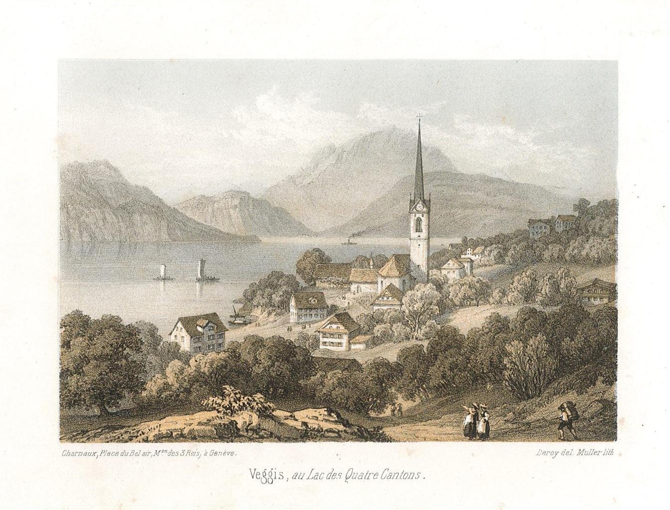 Veduta, antica ed originale, stampata a colori del paesino di Veggis. Autore: Deroy del & Muller lith. Luogo: Lago 4 Cantoni - Veggis. Anno: 1860 ca. Tecnica: litografia. Dimensioni: 100x135
