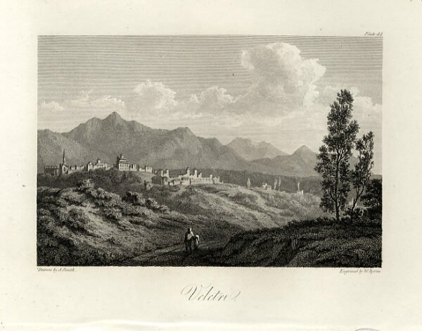 VELLETRI - "Veletri" ampio scorcio paesaggistico con la città sullo sfondo, alberi e viandanti in primo piano.
