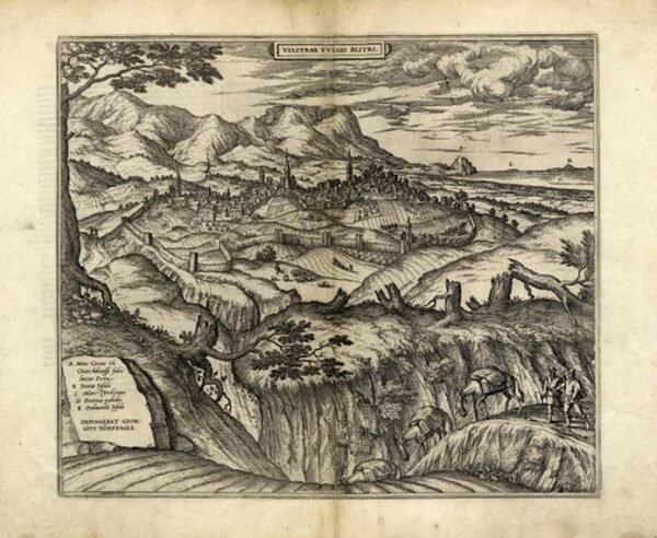 VELLETRI - "Velitrae vulgo Blitri". "Dipingebat Georgius Hoefnagle" Grande e bella veduta panoramica della città e dintorni; alcuni viandanti e tre asini in primo piano in basso a destra. Molto decorativa.
