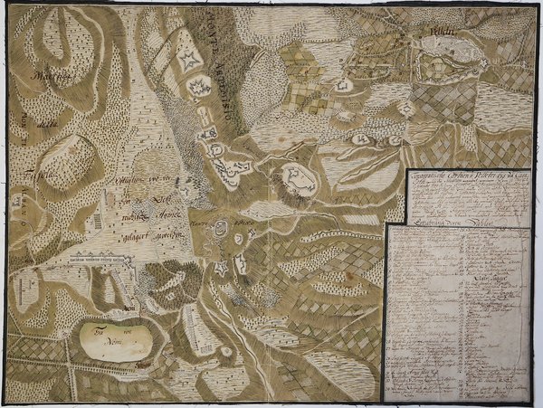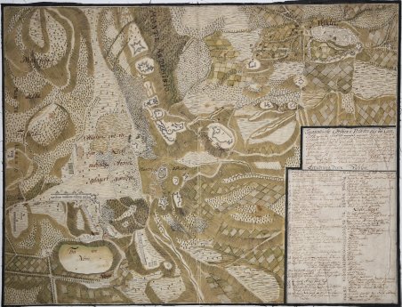Carta topografica del territorio di Velletri, che mostra la situazione, tra il 29 maggio e il 1 novembre del 1744, durante la Battaglia di Velletri tra due eserciti: il napoletano-spagnolo, comandato da Sr. May e le forze austriache guidate del principe V. Lobkowiz.Sono presenti fortificazioni sia sul monte Artemisio che nella frazione de La Faiola.Disegno ad inchiostro ed acquarello su carta, applicato su tela coeva, in perfetto stato di conservazione. 'Topographical Cartes v. Velletri to Casa / Corsi, which shows the situation from 29 May to / 1 Novembr. In 1744 the two armies, the Spanish Neapolitan, under Commando Sr. May, king of both Sicilies, and the Oestreich under the command of Prince v. Lobkowiz, with special explanation as such, had been stored, and ange. Fortifications, which, as well as the other part, were erected on Mount Artemisio, as erected at Fajola, by a king. Cfr.