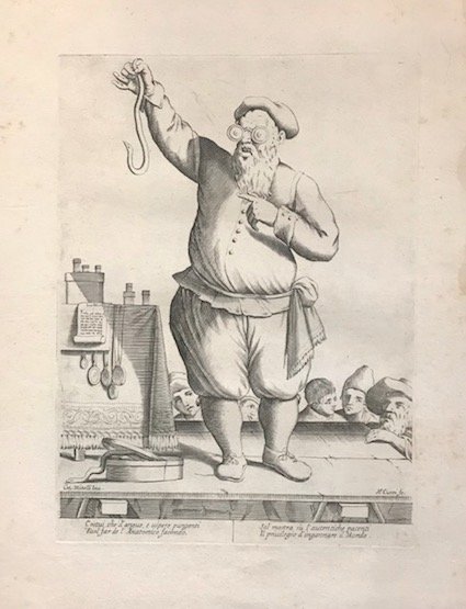 Incisione originale su rame ad opera di Francesco Curti (cm. 19,5x27,5 più ampi margini bianchi) impressa su carta con filigrana. Tratta dalla rara opera ‘L’Arti per via.’. Lievi aloni marginali, peraltro esemplare in ottimo stato di conservazione. Non comune.