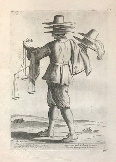 Incisione originale su rame ad opera di Francesco Curti (cm. 19,5x27,5 più ampi margini bianchi) impressa su carta con filigrana. Tratta dalla rara opera ‘L’Arti per via.’. Lievi aloni marginali, peraltro esemplare in ottimo stato di conservazione. Non comune.