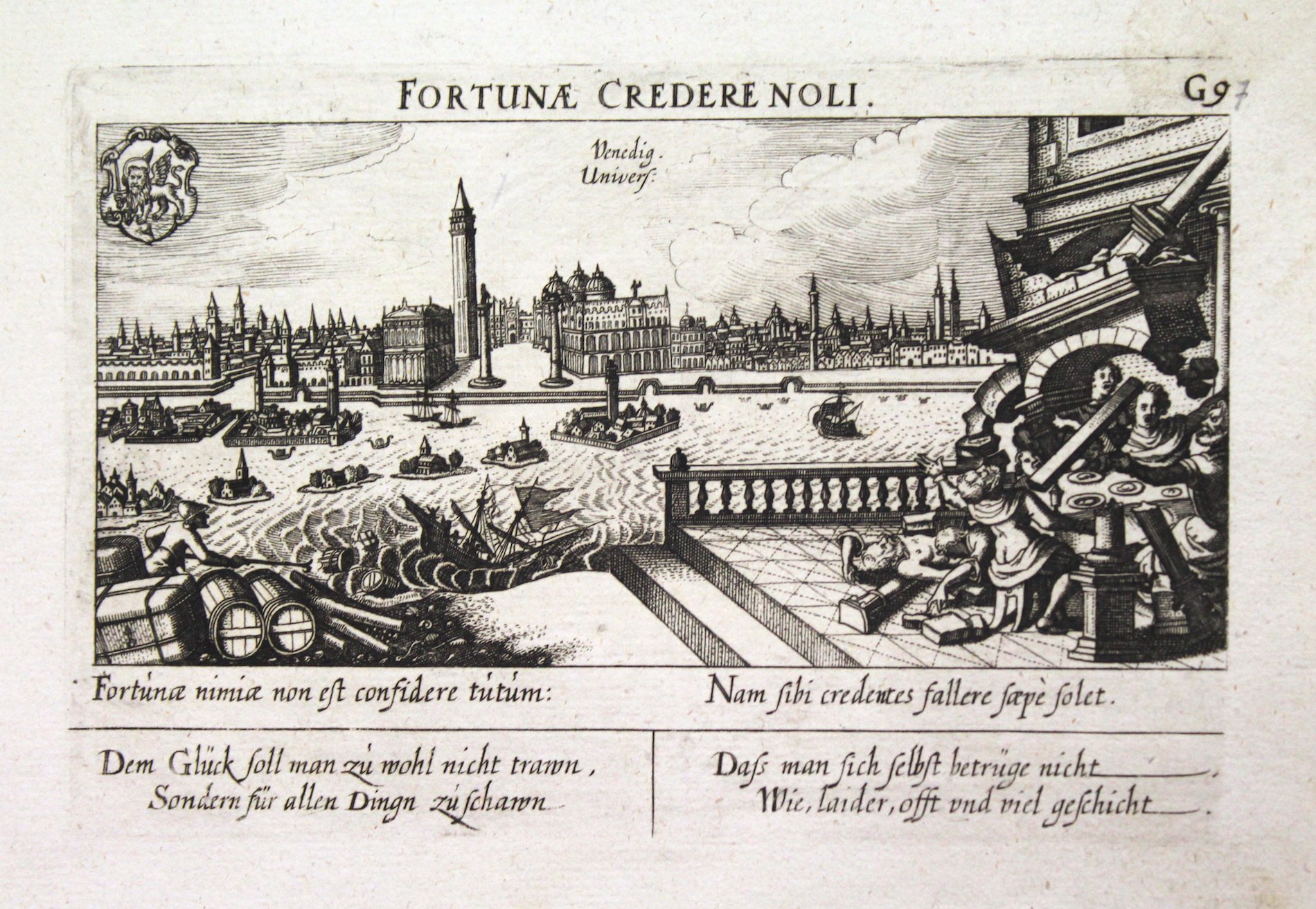 Incisione in rame, mm 96x147. Bella veduta della città con piazza San Marco e Palazzo Ducale in secondo piano, scena allegorica in primo piano; tratta da "Sciographia cosmica" e "Thesaurus philopoliticus". Specchio di stampa non perfettamente perpendicolare al foglio. Ottimo esemplare.