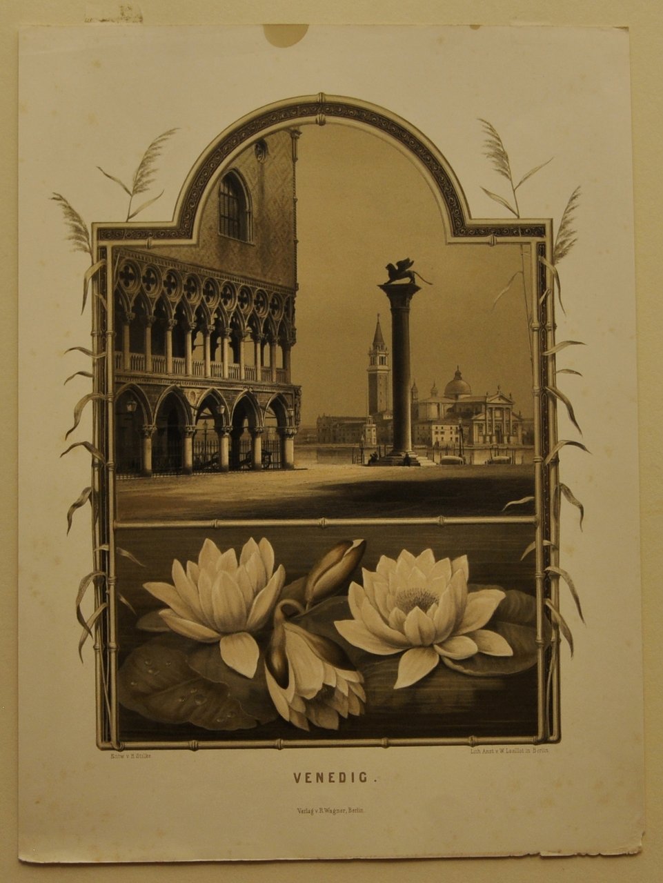 Cromolitografia di mm 460 x 360 su carta spessa. Interessante la immagine dei portici di Palazzo Ducale con i cannoni austriaci.