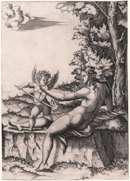 Venere siede sul bordo di uno sperone roccioso; con la mano sinistra afferra il volto di Amore, che tiene con entrambe le mani una torcia accesa. Bulino, 1530-32 circa, privo di firma e indicazioni editoriali. L’opera è ritenuta da Bartsch creazione di Giulio Pippi de' Jannuzzi, detto Giulio Romano (1492-1546), incisa da Agostino Veneziano; Armano, invece, indica il Raimondi quale incisore della lastra. Risale al periodo mantovano di Agostino, dove si ispirava ai soggetti di Giulio Romano. Agostino de Musi, detto Agostino Veneziano, nacque in Veneto, forse a Venezia, intorno al 1490, periodo fissato approssimativamente dagli studiosi in base alle date più antiche incise su alcune stampe. Si recò a Roma nel 1515/16, dove entrò in rapporto con Marcantonio Raimondi, divenendone, insieme a Marco Dente, uno dei principali alfieri e poi collaboratori nella "ditta" Raimondi, la prima vera e propria impresa artistico-commerciale impegnata nella riproduzione di soggetti raffaelleschi. Ad un periodo, fino al 1520, di intensa attività della bottega di Marcantonio seguirono probabilmente anni più difficili dovuti alla morte di Raffaello nel 1520 e all'imprigionamento dello stesso Raimondi intorno al 1523-24 per aver inciso alcuni soggetti lascivi. Il sacco di Roma del 1527 spinse il De Musi a lasciare la città, verso Mantova, attratto da Giulio Romano. La collaborazione con Giulio coincide con un periodo caratterizzato da alti risultati artistici e da un'intensa produzione, risalente agli anni 1530-1532. Queste incisioni rivelano una particolare attenzione verso ricerche di carattere luministico, già presenti forse nei disegni di Giulio Romano, e spesso sottolineate dall'introduzione di sorgenti di luce artificiale che rendono più evidenti i contrasti. La produzione incisoria di Agostino è assai vasta e consistente numericamente, soprattutto se rapportata al breve arco di tempo in cui fu realizzata, all'incirca tra il 1514 e il 1536. Alle 139 incisioni riportate dal Bartsch sono da aggiungere le nuove 4 citate dal Passavant e le 8 riportate dallo Heinecken: si tratta di bulini tutti firmati o contrassegnati dal monogramma, a volte costituito da lettere normali, a volte da caratteri gotici; a queste opere sono da aggiungere anche un gruppo di circa 60 bulini anonimi di probabile o dubbia attribuzione. Magnifica prova, ricca di toni, impressa su carta vergata coeva, rifilata alla linea marginale, sporadiche fioriture visibili sul verso, per il resto in ottimo stato di conservazione. Due timbri di collezione al verso: uno della collezione Johann Melchior von Birckenstock (Lugt 345), ed un altro non leggibile. Bibliografia Le Blanc C., Manuel De L'amateur D'estampes, 44, V 0003 p 00075, 1854-59; AAVV, The Illustrated Bartsch, 318, V 0026 p 00320, 1978-1983; Donata Minonzio, DE MUSI (Di Musi, De Musis, Musi), Agostino, detto Agostino Veneziano in “Dizionario Biografico degli Italiani” - Volume 38 (1990). Venus sits on the edge of a rocky outcrop; with her left hand she grasps the face of Love, who holds a lighted flashlight in both hands. Engraving, c. 1530-32, lacking signature and printing details. The work is believed by Bartsch to be the creation of Giulio Pippi de' Jannuzzi, known as Giulio Romano (1492-1546), engraved by Agostino Veneziano; Armano, however, indicates Raimondi as the engraver of the plate. It dates from Agostino's Mantua period, where he was inspired by Giulio Romano's subjects. Agostino de Musi, known as Agostino Veneziano, was born in the Veneto, possibly in Venice, around 1490, a period set approximately by scholars based on the earliest dates engraved on some prints. He went to Rome in 1515/16, where he entered into a relationship with Marcantonio Raimondi, becoming, along with Marco Dente, one of his principal pupil and later collaborators in the Raimondi “firm,” the first real artistic-commercial enterprise engaged in the reproduction of Raphaelesque subjects. A period, until 1520, of intense activity in Marcantonio's workshop was probably followed by more difficult years due to Raphael's death in 1520 and the imprisonment of Raimondi himself around 1523-24 for engraving some lascivious subjects. The Sack of Rome in 1527 prompted De Musi to leave the city, heading for Mantua, attracted by Giulio Romano. The collaboration with Giulio coincided with a period characterized by high artistic achievements and intense production, dating from the years 1530-1532. These engravings reveal a particular attention to luministic research, perhaps already present in Giulio Romano's drawings, and often emphasized by the introduction of artificial light sources that make contrasts more evident. Agostino's engraving production is very large and numerically consistent, especially when compared to the short time span in which it was produced, roughly between 1514 and 1536. To the 139 engravings reported by Bartsch must be added the new 4 cited by Passavant and the 8 reported by Heinecken: these are all signed or monogrammed engravingss, sometimes consisting of normal letters, sometimes of Gothic characters; to these works must also be added a group of about 60 anonymous enrgavings of probable or doubtful attribution. Magnificent proof, richly toned, printed on contemporary laid paper, trimmed at marginal line, in excellent condition. Two collection marks on verso: one from the Johann Melchior von Birckenstock collection (Lugt 345), and another unreadable. Bibliografia Le Blanc C., Manuel De L'amateur D'estampes, 44, V 0003 p 00075, 1854-59; AAVV, The Illustrated Bartsch, 318, V 0026 p 00320, 1978-1983; Donata Minonzio, DE MUSI (Di Musi, De Musis, Musi), Agostino, detto Agostino Veneziano in “Dizionario Biografico degli Italiani” - Volume 38 (1990). Cfr.