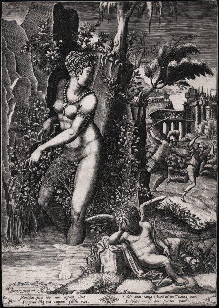 Bulino, 1564, datato e firmato “Gas/ .P. F. /1564” su una tavoletta sotto il piede di Cupido; su un’altra tavoletta, in basso al centro, l’iscrizione L./PENIS/.R./.IN.' Da un soggetto di Luca Penni.Nel margine inferiore, due distici in latino 'Mortiferis spinis toto sum corpore loesa./Purpurea estq. meo sanguine facta rosa./Dulcis amor causa est: sed nil mea vulnera curo./Eripiam crudis dum puerum manibus'.Esemplare nel secondo stato di tre, con l’indirizzo di Antonio Lafrery aggiunto in basso a destra all’excudit di Niccolò Nelli posto al centro, tra i due distici. Magnifica prova, ricca di toni e ben contrastata, impressa su carta vergata, con filigrana non leggibile, completa della linea marginale, una piega di carta sul margine sinistro, verso il basso, nel complesso in eccellente stato di conservazione. Questa magnifica incisione, è una copia, nello stesso verso e all’incirca delle stesse dimensioni, di un bulino di Giorgio Ghisi, datata 1556.Si tratta di una delle sei incisioni, finora conosciute, che nel 1564 Gaspar ab Avibus dal suo maestro Giorgio Ghisi. L’inventor dichiarato del soggetto è Luca Penni, pittore e disegnatore.Alla lettera “Sono ferita i tutto il corpo da spine mortali/ e col il mio sangue ho reso purpurea la rosa/ l’Amore ne è la causa, ma non mi preoccupo delle ferite/ finchè (non) strapperò dalle mani crudeli il fanciullo.Nell’incisione è raffigurata in primo piano Venere, con i piedi immersa nell’acqua che osserva di nascosto la scena sullo sfondo con Adone inseguito da Marte.I versi chiariscono l’immagine: “Sono ferita i tutto il corpo da spine mortali/ e col il mio sangue ho reso purpurea la rosa/ l’Amore ne è la causa, ma non mi preoccupo delle ferite/ finchè (non) strapperò dalle mani crudeli il fanciullo.” Venere è stata punta da alcune spine e il suo sangue ha colorato di rosso una rosa. La dea però non si cura delle ferite perché ha in animo di salvare il giovane e amato Adone dalle “mani crudele” di Marte.Secondo alcune versioni del mito infatti, la dea di punge con una spina di rosa mentre sta correndo in soccorso di Adone inseguito da Marte e macchiate dal sangue della dea, le rose da bianche diventarono rosse. Engraving, 1564, inscrideb on a tablet lower right “Gas/ .P. F. /1564”.Inscribed on a tablet lower centre: '.L./PENIS/.R./.IN.', and in the lower margin with a Latin poem of two distychs: 'Mortiferis spinis toto sum corpore loesa./Purpurea estq. meo sanguine facta rosa./Dulcis amor causa est: sed nil mea vulnera curo./Eripiam crudis dum puerum manibus'.Example in the second state, of three, with “Ant. Lafrerij Formis” added in the bottom right corner to the inscription “Niccolaus /Nelli exc” in a diamond in center of bottom margin. Magnificent example, rich tones and good contrast, printed on laid paper with an unidentified watermark, complete of the marginal line, a paper fold in the left margin, overall in excellent condition.This magnificent work is a copy, in the same direction and about the same size, after Giorgio Ghisi’engraving, dated 1556.It is one of six engravings, so far known, that in 1564 Gaspar ab Avibus made after his teacher Giorgio Ghisi.The composition for this print is based on a design (now lost) by Luca Penni, who in turn was influenced by an episode in the Hypnerotomachia Polifili, as can be seen in the poses of the three main figures. In this episode, Venus scratches her leg upon a rosebush, while Mars attacks Adonis. It is the blood of Venus which transforms the white rose to red.The Latin inscription at the bottom of this Ghisi print gives us a clue as to what is happening: "With deadly thorns I have been wounded in my whole body, and the rose has become purple through my blood/Sweet love is the cause, but in no way do I care for my wounds [i.e., I won't attend to my wounds at all] Until I rescue the boy from cruel hands” A very rare work Cfr. G. Streliotto, Gaspar ab Avibus, p. 24 n. 4; Bartsch XV, 400 n. 40; Lewis, p. 95 n. 22; Bellini, pp. 129-135
