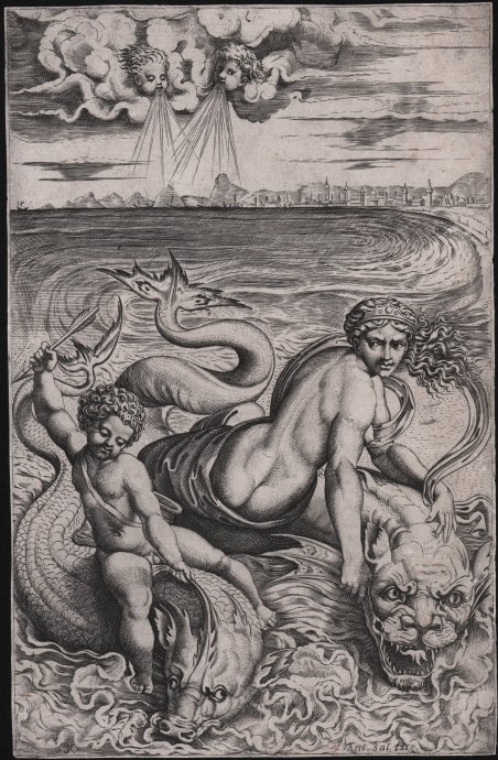 Venere e Cupido a cavallo di due creature marine; Cupido tiene nella mano destra una freccia sopra la testa come se volesse colpire la creatura; due personificazioni di venti che soffiano tra le nuvole. Bulino, 1516 circa, firmato in basso a destra con i dati editoriali dello stampatore “Ant. Sal. exc.”. Deriva da un disegno di Raffaello, oggi perduto, per l'affresco di Giulio Romano sulla parete sud della Stufetta Bibbiena in Vaticano. L'affresco e l'incisione presentano alcune differenze, in particolare l'aggiunta di un paesaggio urbano sullo sfondo della stampa e i due venti sovrastanti, che potrebbero essere stati inclusi nel disegno preparatorio originale dell'affresco. Esemplare del secondo stato di tre, con l'imprint di Antonio Salamanca e prima dell'indirizzo di Guidetti. Magnifica impressione, su carta vergata coeva, rifilata al rame, restauri perfettamente eseguiti agli angoli, per il resto in ottimo stato di conservazione. “L'incisione deriva da un disegno disperso di Raffaello che fece da modello per l'affresco dipinto nella parete sud della Stufetta del Cardinal Bibbiena, dal quale differisce per la presenza sullo sfondo di una città portuale e di due Eoli fra le nubi, intenti a soffiare. La raffigurazione di Venere e Amore che solcano le onde cavalcando i delfini presenta una struttura compositiva che richiama la Venere Anadiomene, anch'essa derivata da Dente da un disegno preparatorio per un altro affresco della Stufetta del Cardinal Bibbiena, e di cui questa stampa può essere considerata il pendant. I singoli motivi presenti nell'incisione derivano probabilmente da antichi bassorilievi presenti nei sarcofagi romani. L'incisore infatti attinge dal repertorio classico derivando dagli eroti presenti nei rilievi antichi la figura di Amore che cerca di affrettare il viaggio a dorso di delfino agitando una freccia in aria. I mostri marini sembrano invece derivare dalla Lotta degli Dei marini di Mantegna (Bartsch, XII, 17-18). Anche la figura di Venere, pur colta di schiena e nella precarietà della sua posizione, si ispira a modelli classici. Il corpo è reso con accuratezza e rivela, nonostante l'arditezza dello scorcio e della posizione obliqua rispetto alla superficie dell'acqua, una perfetta organicità e una grande naturalezza dei movimenti nello spazio. Il modellato del corpo di Venere, più ancora che con la Galatea della Farnesina, incisa sia da Marcantonio che da Dente (Bartsch, XIV, 350 e 351), può essere confrontato con i disegni di Raffaello Ebe e Proserpina di Haarlem e con le Tre grazie di Windsor. In base a questi argomenti è possibile supporre che il disegno preparatorio di questa incisione fosse opera di Raffaello e che la stampa sia contemporanea alle altre raffigurazioni della serie relativa agli affreschi della Stufetta, databile intorno al 1516” (cfr, A. Imolesi Pozzi, Marco Dente un incisore ravennate nel segno di Raffaello. Le stampe della raccolta Piancastelli, p. 72). Bibliografia Passavant, 1860, II, p. 230, 210; Bianchi, 1968, p. 685, nota 219; Becatti, 1968, p. 546, fig. 106; Oberhuber, 1978, vol. 27, p. 16; Raphael invenit, 1985, pp. 61, n. II.1 (testo di S. Massari); Raffaello in Vaticano, 1984, p. 205, n. 75 (testo di R. Harpath); Oberhuber, Gnann, 1999, p. 105, fig. 44 (testo di A. Gnann); A. Imolesi Pozzi, Marco Dente un incisore ravennate nel segno di Raffaello. Le stampe della raccolta Piancastelli, p. 72, n. 10. Venus and Cupid riding on the backs of two sea creatures (dolphins?); Cupid holding a arrow above his head in his right hand as if to strike the creature; two personifications of winds blowing in the clouds above. Engraving, 1516 circa, lettered bottom right 'Ant. Sal. exc.'. After Raphael's design, now lost, for Giulio Romano's fresco on the south wall of the Stufetta Bibbiena at the Vatican. There are differences between the fresco and engraving, namely in the addition of a cityscape in the background of the print and the two winds above which may have been included in the original preparatory drawing for the fresco. Example of the second state of three, with the Antonio Salamanca imprint and before the Guidetti address. A fine, early, impression, on contemporary laid paper, trimmed to the platemark, perfectly executed restorations at corners, otherwise in excellent condition. The depiction of Venus and Cupid plowing through the waves riding dolphins has a compositional structure reminiscent of the Venus Anadiomene, also derived by Dente from a preparatory drawing for another fresco in Cardinal Bibbiena's Stufetta, and of which this print can be considered the pendant. The individual motifs in the engraving are probably derived from ancient bas-reliefs found in Roman sarcophagi. In fact, the engraver draws from the classical repertoire by deriving from the heroes present in the ancient reliefs the figure of Cupid attempting to hasten his journey on the back of a dolphin by waving an arrow in the air. The sea monsters, on the other hand, seem to derive from Mantegna's Struggle of the Sea Gods (Bartsch, XII, 17-18). The figure of Venus, though caught from the back and in the precariousness of her position, is also inspired by classical models. The body is accurately rendered and reveals, despite the boldness of the foreshortening and the oblique position relative to the surface of the water, a perfect organicity and a great naturalness of movement in space. The modeling of the body of Venus, even more than with the Galatea of the Farnesina, engraved by both Marcantonio and Dente (Bartsch, XIV, 350 and 351), can be compared with Raphael's drawings Hebe and Proserpine of Haarlem and with the Three Graces of Windsor. On the basis of these arguments it is possible to assume that the preparatory drawing for this engraving was the work of Raphael and that the print is contemporary with the other depictions in the series relating to the Stufetta frescoes, which can be dated to around 1516. Bibliografia Passavant, 1860, II, p. 230