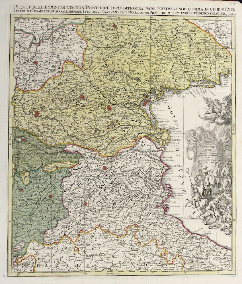 Incisione in rame, mm. 485x568, fascinosa coloritura d'epoca a tutto campo, titolo in alto al di fuori della cornice. <BR>Non comune carta con bellissimo cartiglio a destra raffigurante una battaglia che riporta la seguente dicitura "Lombardia inter Carolum austriacum Philippum Andegavensem disputata. Capto Gallor. Generali Villeroy".<BR>Bell'esemplare ben conservato con qualche lieve restauro dovuto alle ossidazioni del colore antico lungo le linee di confine verdi. <BR>