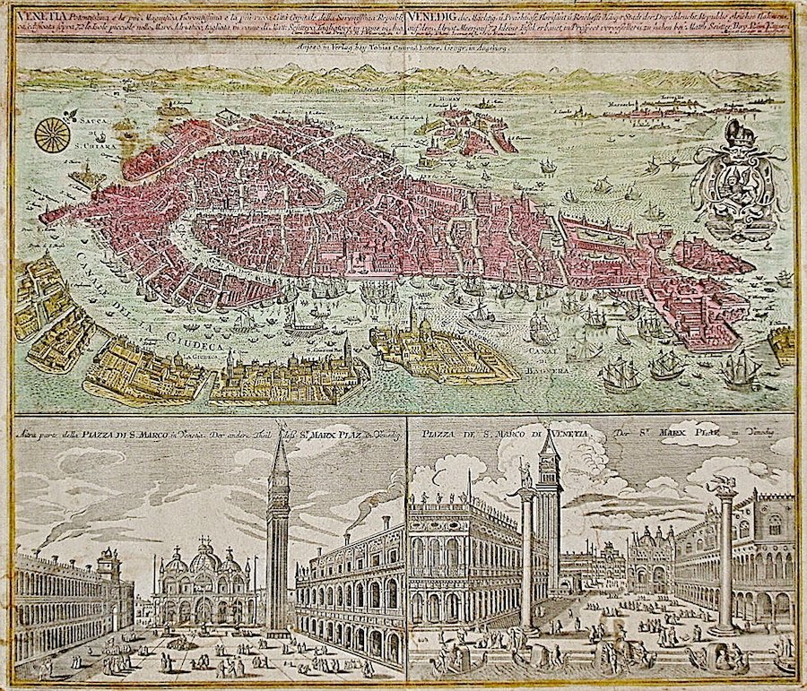 Incisione in rame, coloritura coeva, mm 507x588. <BR>Scenografica stampa che presenta una pianta prospettica della città nella parte alta, accompagnata a due vedute di piazza San Marco in basso. Cartiglio con leone alato in alto a destra. Seutter, dopo un apprendistato presso Homann a Norimberga, trasferitosi ad Augsburg verso il 1720, aprì la propria attività superando il maestro sotto il profilo della bellezza: le sue carte hanno sempre colori brillanti e cartigli elaborati.<BR>Buon esemplare con qualche macchia e margine sup. breve. <BR>Moretto, 157, II stato/III; Cassini, 73.