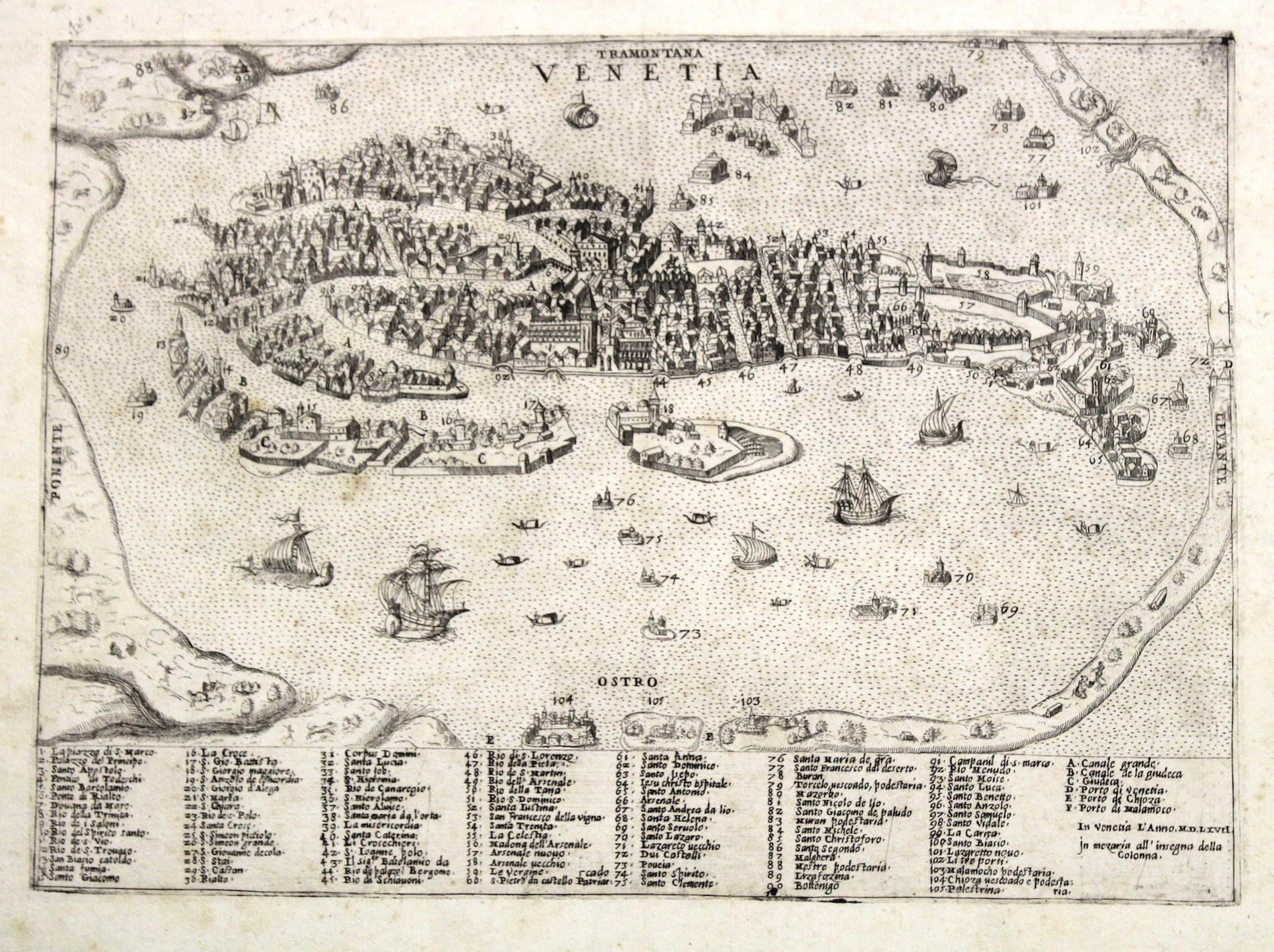 Incisione in rame, mm 190x265. Rarissima veduta tratta da “Il primo libro delle citta, et fortezze principali del mondo”, edito nel 1567, le cui lastre furono riutilizzate da Giulio Ballino nel 1569 con l’aggiunta di testo al verso per la sua opera “De’ disegni delle più illustri città et fortezze del mondo” edito da Bolognino Zaltieri. Paolo Forlani veronese fu attivo a Venezia tra il 1560 e il 1574 come incisore e mercante. Le sue incisioni, in gran parte di soggetto geografico, furono pubblicate dai principali editori e stampatori veneziani. Egli collaborò spesso con Gastaldi del quale incise ben 13 carte. La sua opera più importante è la raccolta “Il primo delle città, et fortezze principali del mondo”, prima organica collezione di cartografia urbana stampata in Italia, con incisioni datate 1566 e 1567. Forlani non pubblicò mai la seconda parte e consegnò i rami a Zenoi che nello stesso anno li riutilizzò in una sua raccolta senza titolo. Dopo il 1574 si perdono sue notizie. Molto probabilmente morì durante la grande peste che colpì Venezia tra il 1575 ed il 1576. Bell’esemplare con buoni margini. Manca a Moretto “Venetia, le immagini della Repubblica” e Cassini “Piante e vedute prospettiche di Venezia”.