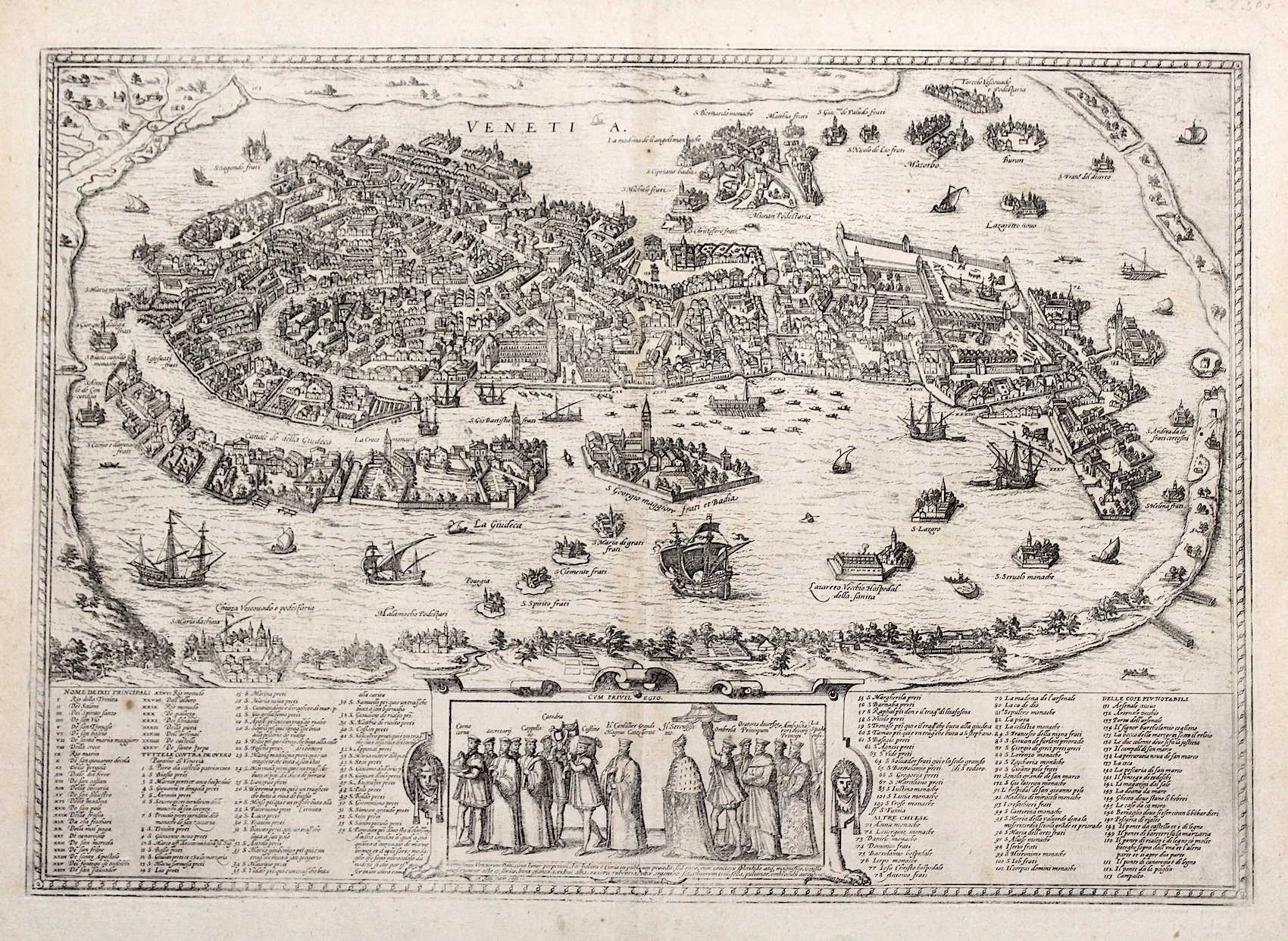 Incisione in rame, mm 340x480. Veduta panoramica a volo d'uccello della Serenissima. La parte inferiore è arricchita da un grande cartiglio raffigurante il corteo ducale nel giorno del Corpus Domini, ispirato dalla grande opera incisa da Matteo Pagano nel 1559. Tratta da "Civitates Orbis Terrarum", pietra miliare del vedutismo, stampata dal 1572 al 1617 in 6 volumi pubblicati in anni differenti in varie lingue. Ottimo esemplare.<BR>Moretto, Venetia le immagini della Repubblica, 26; Cassini, 18.