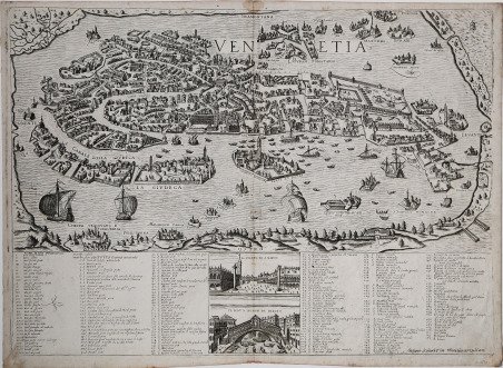 In alto al centro, a caratteri grandi ed interrotto dall’isola di Murano, è inciso il titolo: VENETIA. Nella parte inferiore della tavola sono incise le vedute di Piazzetta S. Marco e del ponte di Rialto. Ai lati della vignetta centrale si trova una legenda alfanumerica di 203 rimandi (I-XXXV e 1-170, ma sono mancanti i numeri XIV e 66) distribuita su sei colonne. I primi 34 nomi, contrassegnati con numeri romani, sono intitolati NOME DE IRII PRINCIPALI, una descrizione dei canali della città. Seguono TUTTE le contrade overo parochie, 169 rimandi contrassegnati con numeri arabi a contrade o parrocchie e chiese. Sulla tavola sono presenti alcune indicazioni toponomastiche. Orientazione nei quattro lati al centro con il nome dei venti: TRAMONTANA, OSTRO, LEVANTE, PONENTE, il nord è in alto. Pianta prospettica della città, anonima, priva di data ed indicazioni editoriali nella sua prima stesura, finora sconosciuta alla letteratura e qui per la prima volta pubblicata. Si tratta di una replica della pianta incisa da Giacomo Franco nel 1597; come nota giustamente Cassini sono presenti nella tavola “perfino certi preziosismi calligrafici così cari al Franco”. Si potrebbe pensare, pertanto, anche ad un’ulteriore versione ' dello stesso autore. In basso al centro sono rappresentate le vedute di San Marco e del Ponte di Rialto, già presenti nella pianta di Bernardo Salvioni (1597) che l’autore di questa lastra potrebbe forse aver esaminato. ' La datazione dell’opera, quindi, è sicuramente successiva al 1597. Schulz fa notare come siano indicati sia il toponimo del Redentore che delle Zitelle, ma manchi poi il disegno dell’edificio sulla pianta. La matrice ' conosce una prima ristampa (che finora era considerata come il primo stato della lastra) per i torchi della ' tipografia di Francesco Valegio e Catarin Doino. Questa tiratura può essere ricondotta al 1611 circa, anno ' dell’unica incisione datata nota della tipografia. Il terzo stato della lastra reca solo il nome del Valegio; tale tiratura deve essere successiva al 1614, anno in cui terminò il sodalizio editoriale con il Doino. Nel 1622 la lastra fu usata dall’editore Nicolò Misserini, che la inserì in un foglio volante composto dalla pianta (corpus centrale), da due strisce incise raffiguranti 94 dogi (da Paolo Lucio Anafesto a Francesco Contarini) recanti l’imprint Francesco Vallegio et forma in Venetia, e da un foglio tipografico che fornisce delle indicazioni storico-geografiche sulla città. Entrambi gli imprint del Valegio, sia quello nella pianta che quello nella tavola raffigurante i dogi, sono leggibili ma chiaramente abrasi, segno che le due matrici erano ormai passate di mano. La tavola dei dogi era stata prodotta dal Valegio durante il regno di Leonardo Donà (1606-12) e pertanto la lastra fu aggiornata con l’aggiunta dei ritratti degli ultimi cinque dogi in basso a destra. Proprio dall’ultimo doge ritratto, Francesco Contarini (1623-24) si ricava la datazione di questa edizione, sicuramente anteriore al 1625. ' La sola lastra della pianta fu poi ristampata nel corso del XVII secolo da Stefano Scolari, Domenico Lovisa e Giovanni Antonelli. ' Esemplare nel quinto stato di sette descritto in Bifolco-Ronca, con l’indirizzo di Stefano Mozzi Scolari aggiunto in basso a destra. Tiratura databile tra il 1640 e il 1660. Acquaforte e bulino, impressa su carta vergata coeva, con margini, in ottimo stato di conservazione. Magnifica e rara pianta prospettica di Venezia. Bibliografia Bifolco-Ronca, Cartografia e topografia italiana del XVI secolo, tav. 1273, V/VII; Bury (2001): p. 181, n 118; Cassini (1971): n. 30; Moretto (2001): nn. 53, 110; Nagler, (1911): XVIII, p. 154; Schulz (1970): p. 61, nn. 60-63. At the top center, in large letters and interrupted by the island of Murano, is engraved the title: VENETIA. In the lower part of the table are engraved views of Piazzetta S. Marco and the Rialto bridge. On the sides of the central vignette there is an alphanumeric legend of 203 cross-references (I-XXXV and 1-170, but the numbers XIV and 66 are missing) distributed over six columns. The first 34 names, marked with Roman numerals, are entitled NOME DE IRII PRINCIPALI, a description of the city's canals. This is followed by ALL contrade overo parochie, 169 cross-references marked with Arabic numbers to contrade or parishes and churches. On the table there are some toponymic indications. Orientation in the four sides in the center with the name of the winds: TRAMONTANA, OSTRO, LEVANTE, PONENTE, the north is at the top. ' Perspective plan of the city, anonymous, without date and editorial indications in its first issue, so far unknown to the literature. It is a replica of the map engraved by Giacomo Franco in 1597; as Cassini rightly notes, "calligraphic preciousnesses so dear to Franco" are present in the map. One could think, therefore, also to a further version of the same author. In the lower center are represented the views of San Marco and the Rialto Bridge, already present in the plan of Bernardo Salvioni (1597) that the author of this plate could perhaps have examined. The dating of the work, therefore, is certainly after 1597. Schulz points out that both the toponym of the Redentore and of the Zitelle are indicated, but the drawing of the building on the plan is missing. The plate knows a first reprinting (which until now was considered as the first state of the plate) for the press of the typography of Francesco Valegio and Catarin Doino. This printing can be traced back to about 1611, the year of the only known dated engraving of the printing house. The third state of the plate bears only the name of Valegio; this issue must be later than 1614, the year in which the publishing partnership with Doino ended. In 1622 the plate was used by the publisher Nicolò Misserini, who inserted it in a flyleaf composed of the plan (central corpus), two engraved strips depicting 94 doges (from Paolo Lucio Anafesto